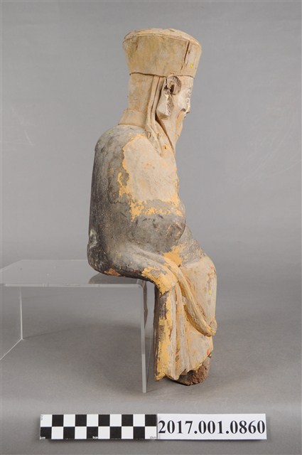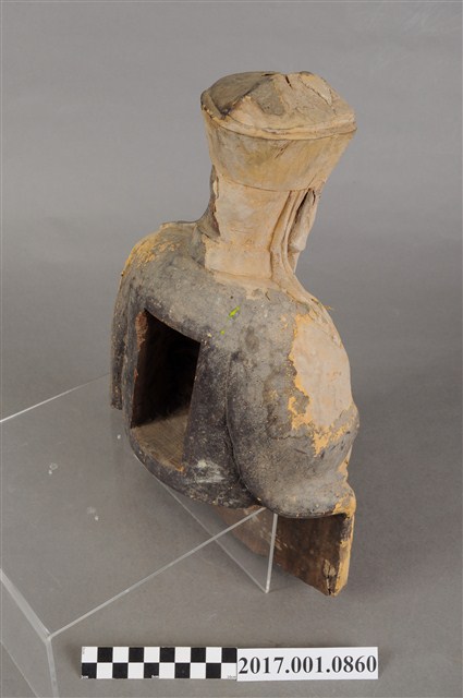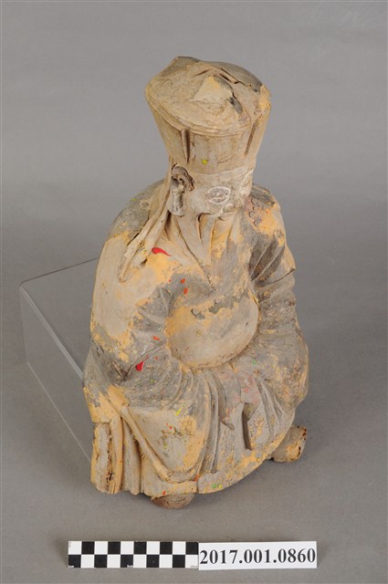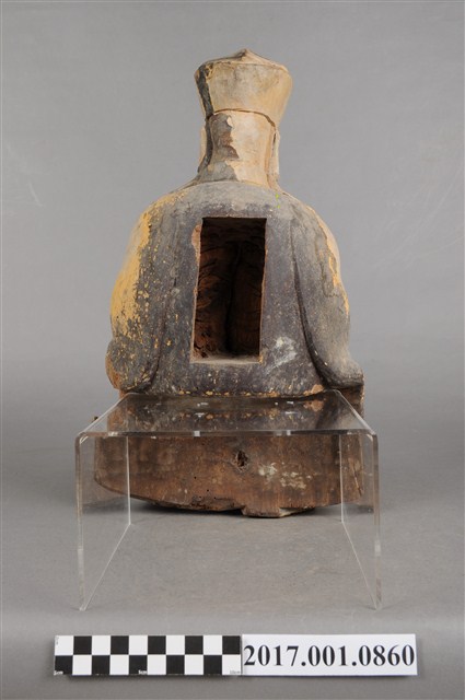 1.本件福德正神像為木雕,表面施以安金彩繪與漆線雕製成,粧佛已除去。神像背部開有長方形入神洞,內部物件已取出。福德正神頭戴忠靖冠,滿臉皺紋,雙目垂視,蓄有長髯,面帶笑容,神情略帶神氣。福德正神身穿長袍,採脫椅技法雕塑,座椅已遺失,長袍上尚殘留部分漆線痕跡。福德正神採抱袖姿態端坐,雙手放置於腹部,露出右手食指,姿態穩重。