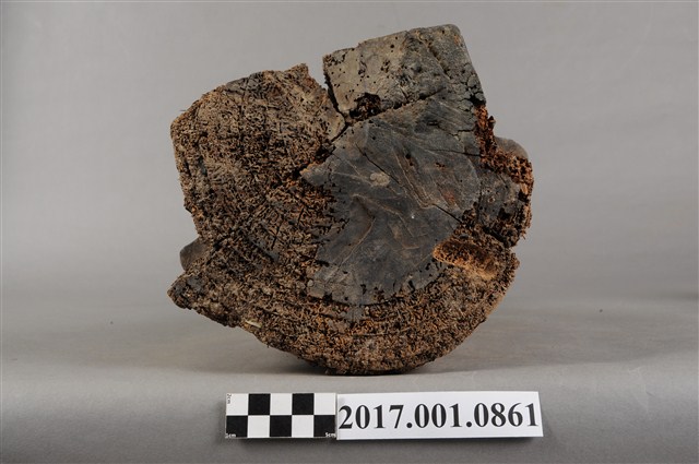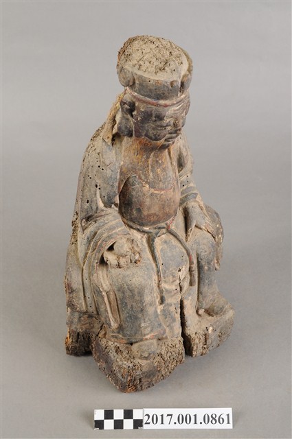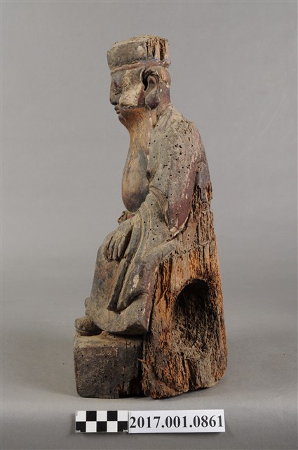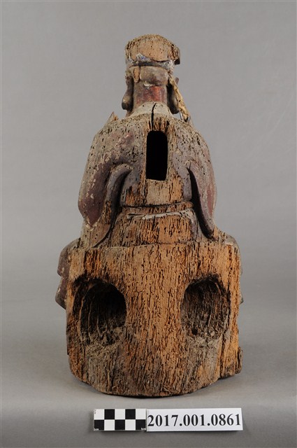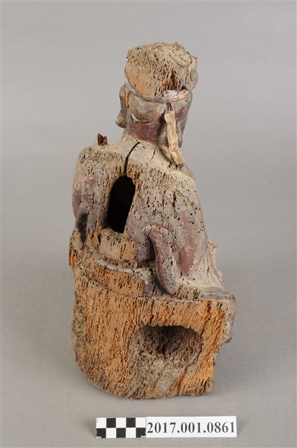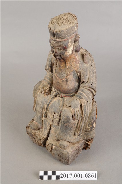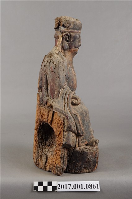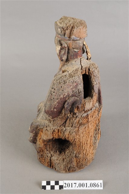 1.本件福德正神像為木雕製成,表面粧佛已經除去。神像背部開有長方形入神洞,內部物件已取出。福德正神頭戴東坡巾,長耳垂,雙目垂視,兩頰豐厚,神情安詳穩重。福德正神身穿朱紅色長袍,端坐於木凳。右手翻掌向上,左手則放在左膝上。