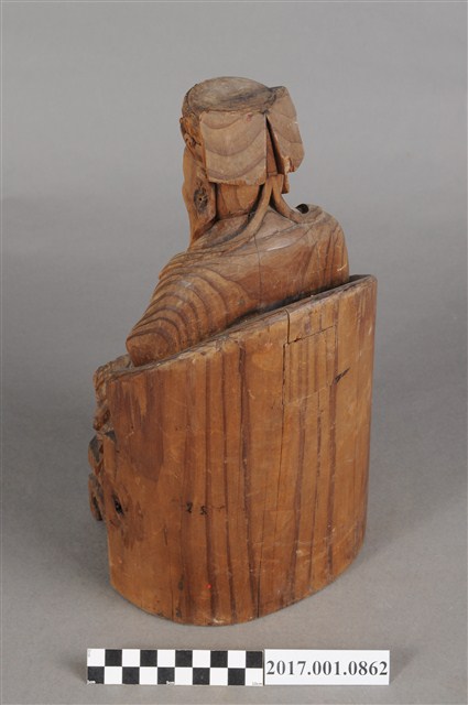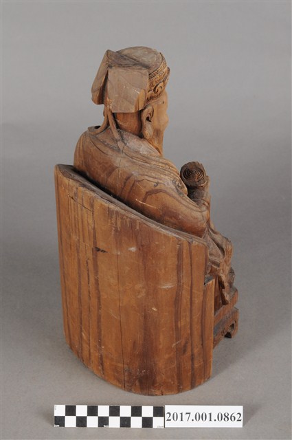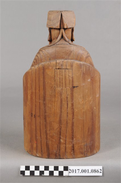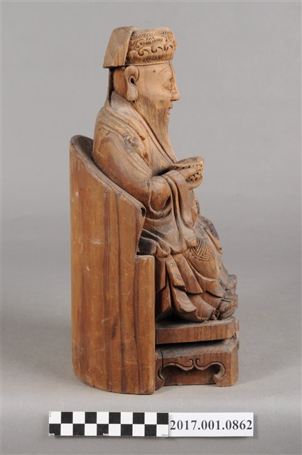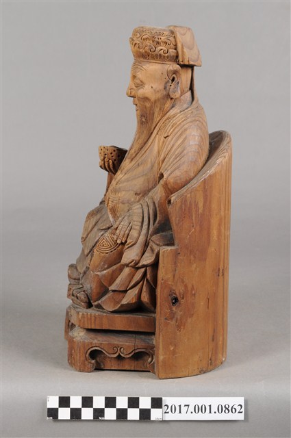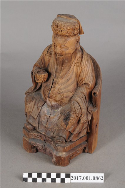 1.本件福德正神為木雕製成,表面粧佛已除去。體型高大,雕刻線條精細,端坐於圈背椅之上。福德正神頭戴員外巾,上面雕有精細的花草紋與帽緣的如意紋。福德正神五官立體,鼻頭臉頰豐腴,額上有數條皺紋,其神情歡樂,張口露齒而笑,口腔內雕有上排牙齒六顆,蓄有垂至腹部的長髯,以雕刻線條表現,福德正神臉部右側有一道明顯之裂痕,福德正神身穿壽字長袍,腹部與雙膝,雙肩處都雕有壽字紋樣,衣袍皺褶線條自然生動,右手持元寶,左手放置於左膝上,元寶則因蟲蛀有許多孔。福德正神腳穿雲頭履,踏於加高的椅凳,椅凳上雕有花草裝飾,並有雲腳。福德正神背後中段有一方形入神洞,封榫尚存。