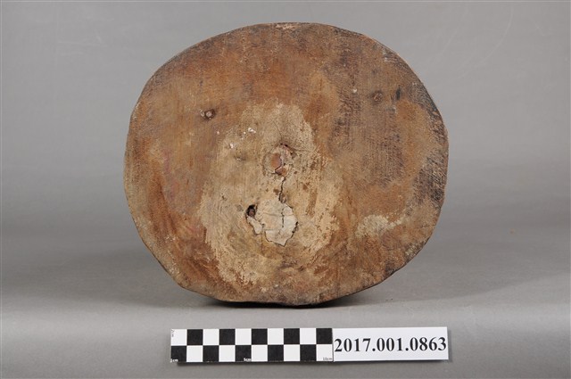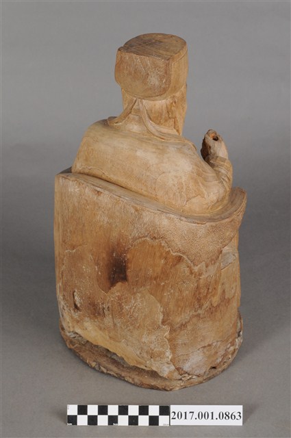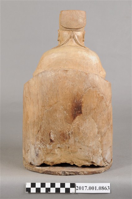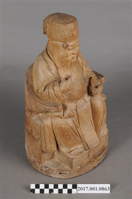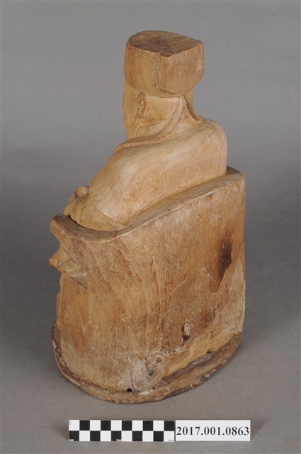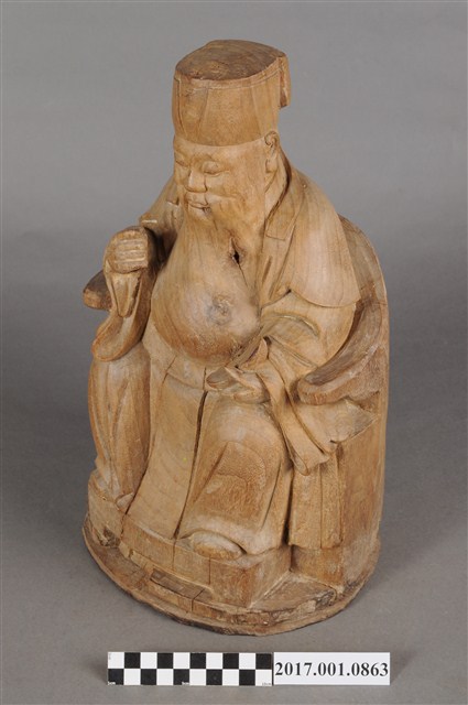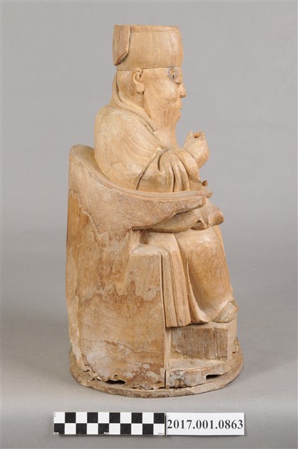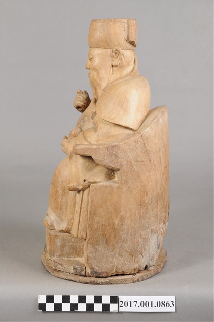 1.本件福德正神像為木雕製成,表面粧佛已除去,雕刻線條簡單有力,且體型較大,姿態穩重,具有氣勢。福德正神頭戴東坡巾,寬臉大耳,神情莊嚴,帶有淺淺自信的微笑。福德正神身穿長袍,長袍未有裝飾,衣褶線條簡單而自然,左手持元寶,右手持拐杖,為拐杖已遺失。雙足踏於踏几,端正端坐於圈背椅之上。