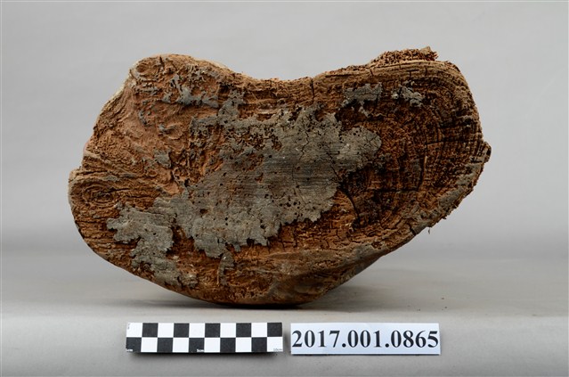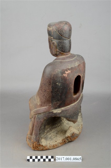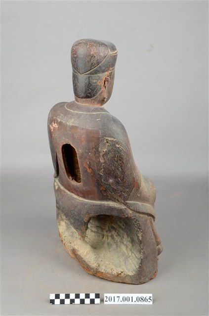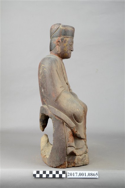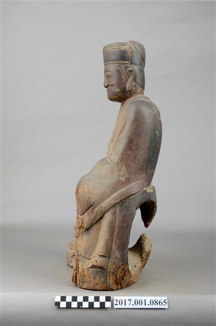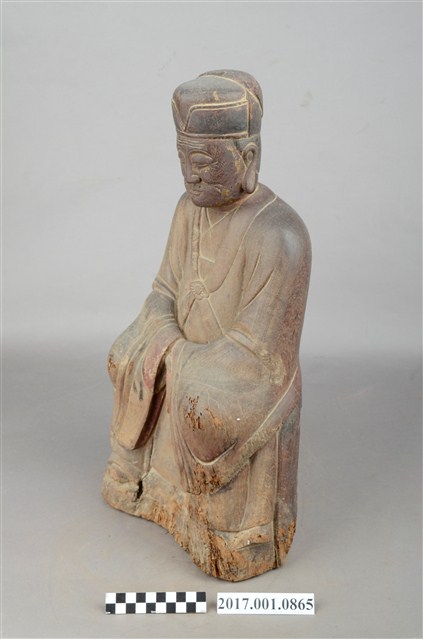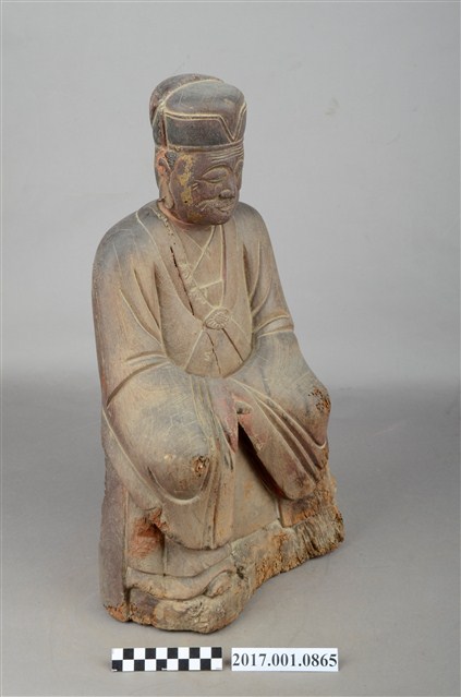 1.本件福德正神像以木雕製成,表面粧佛已除去,背部開有橢圓形入神洞,封榫佚失。福德正神身軀矮胖,造型古樸,雕刻線條粗獷。福德正神頭戴東坡巾,方臉大耳,五官雕刻立體,神情安詳,帶有淺淺的微笑,嘴部有植鬚孔,鬍鬚已脫落。福德正神身穿長袍,裝扮穩重,衣褶線條較為平直,長袍扣環雕刻成菊花圖樣。福德正神採抱袖姿態端坐於岩座之上,雙手放置於腹部,露出右手食指。雙足穿雲頭履,左足部削落。