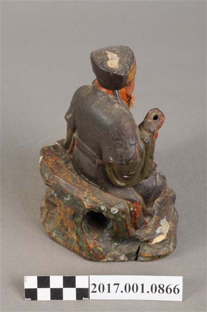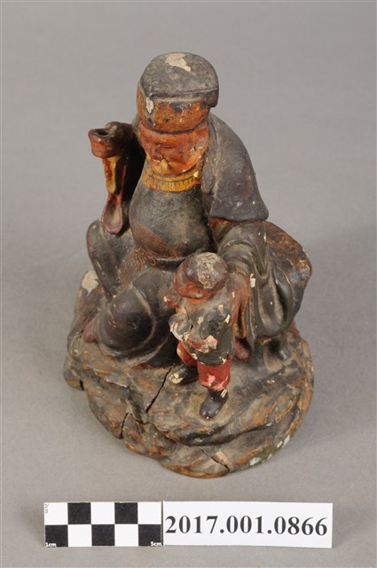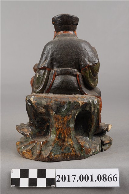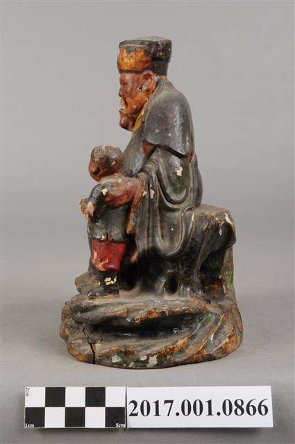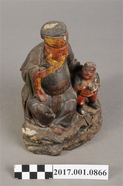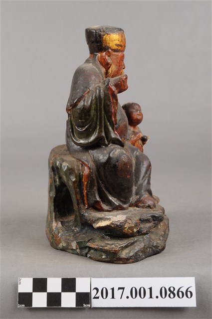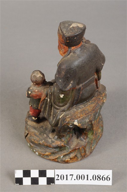 1.本件福德正神像為木雕製成加以彩繪,附有一名童子。福德正神姿態悠閒從容,端坐於岩座上。福德正神頭戴東坡巾,圓臉豐滿,面貌慈祥,蓄有白色鬍鬚。頭梢往左側望向前方。福德正神身穿佛青色長袍,色彩樸素,衣褶線條自然輕柔,左手牽著一名童子,右手則似握有拐杖。雙腿交叉呈現安字形,左腳在前露出穿雲頭履的足部。童子身穿青色布衣,紅褲黑靴。抬頭仰望福德正神,臉部表情因風化而不清。童子左手持元寶,右手則似握有物品但已不清楚。神像整體保持完整,岩座處有三道明顯裂縫。