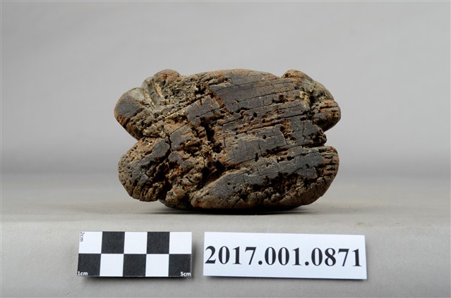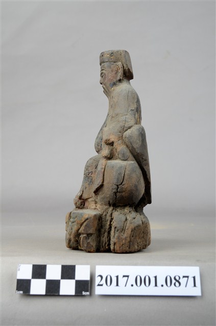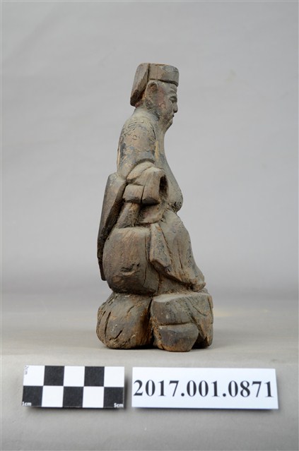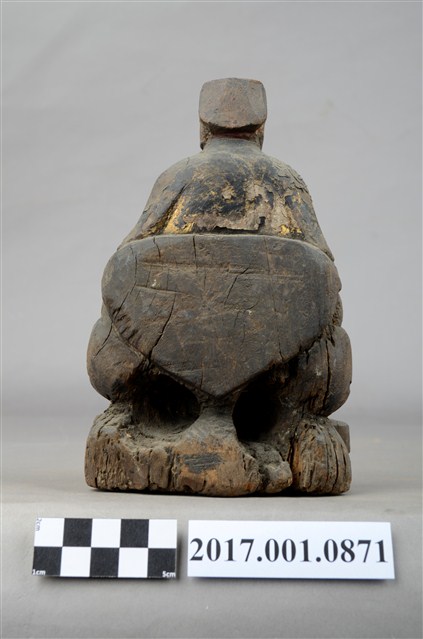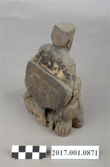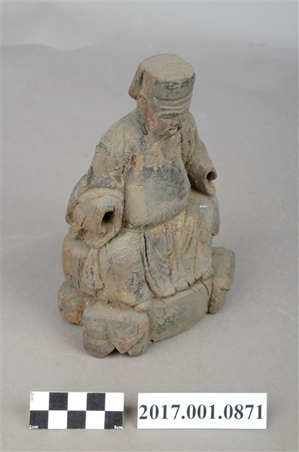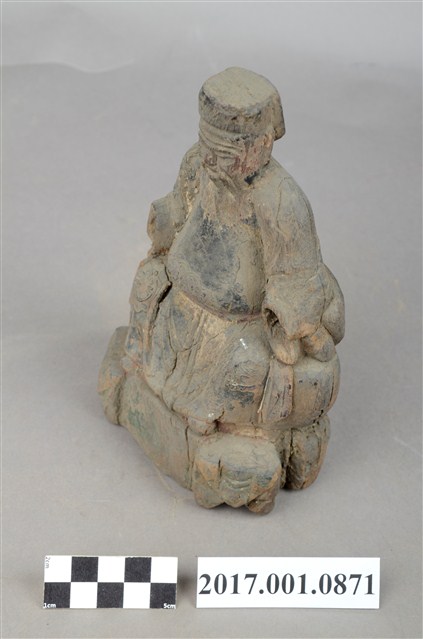 1.本件福德正神像以木雕製成,表面安金與彩繪粧佛已除去。福德正神端坐於圈背椅上,姿態輕鬆自然,樣式古樸。福德正神頭戴圓巾,五官立體,臉頰豐腴,蓄有長髯,神情莊嚴,雙眼微閉似在沉思。福德正神身穿長袍,袍上裝飾紋樣不明,衣褶線條柔美簡單。福德正神雙手手掌皆遺失,不知所持何物,亦可知福德正神雙手可以取下替換,雙足踏於臺座。神像整體遭受蟲蛀侵蝕嚴重,臺座部分蛀出許多孔。