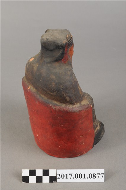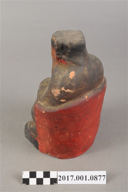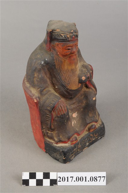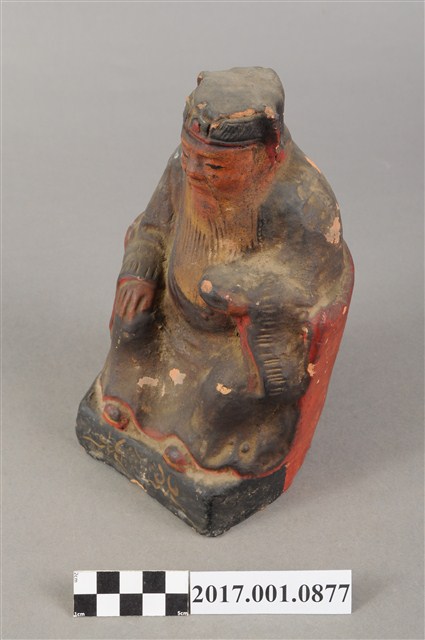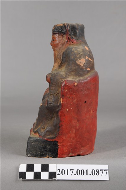 1.本件福德正神像為磚燒,表面彩繪而成。造型質樸。福德正神頭戴忠靖冠,五官以彩繪呈現,蓄有白色鬍鬚,臉型稍瘦,表情較為嚴肅。福德正神身穿藍色長袍,左手持元寶,右手按於右膝,端坐於圈背椅上。表面佈滿污漬,袍服下襬、元寶局部剝落,露出朱紅磚胎顏色。