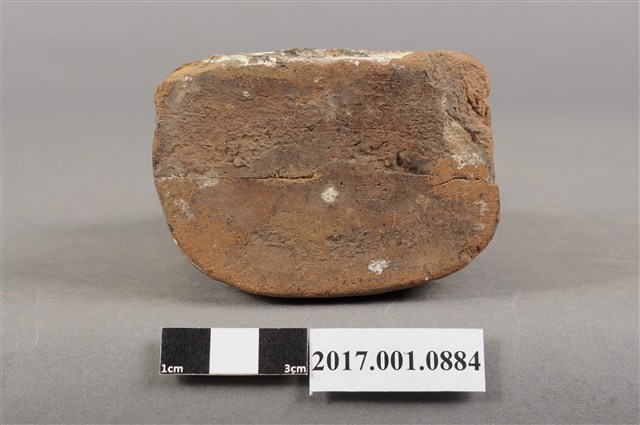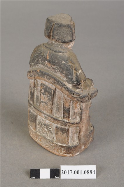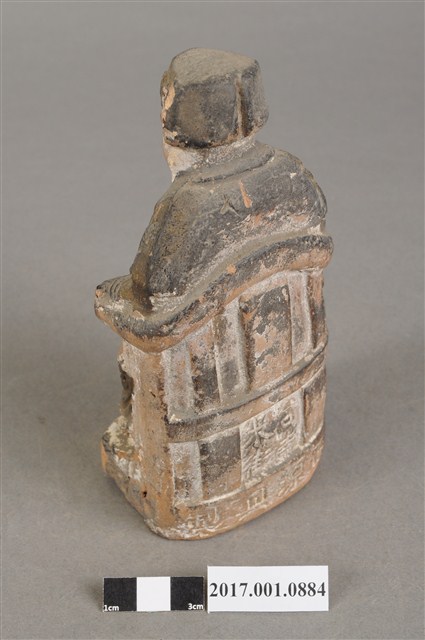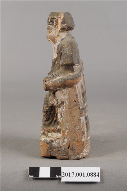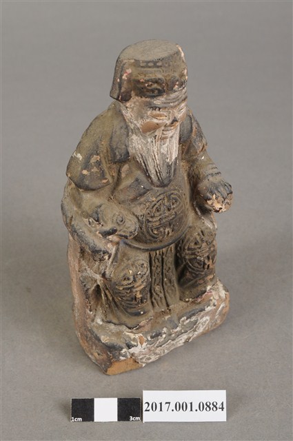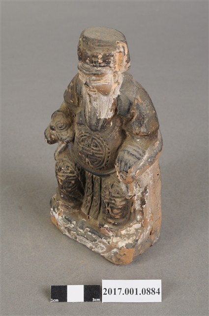 1.本件福德正神像為磚燒,表面施以彩繪裝飾,造型古樸。福德正神頭戴東坡巾,臉頰豐腴,面帶微笑,表情和藹可親,蓄有長至胸前的白鬚。福德正神身穿藍色壽字長袍,腹部與膝部作浮雕團壽紋樣,下擺劍帶雕有花草紋,雕刻精細,右手持元寶,左手按於扶手上,雙足踏於椅几,端坐於圈背椅之上,臺座磨損不清。神像背後圈背椅底部空間刻有「台南米街」,為字跡稍有剝落。臺座則落款正源興製。為臺南市米街正源興所製。