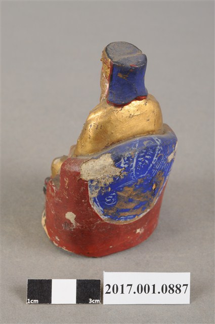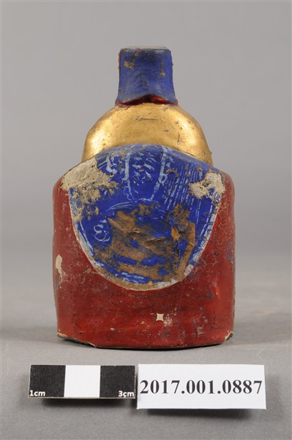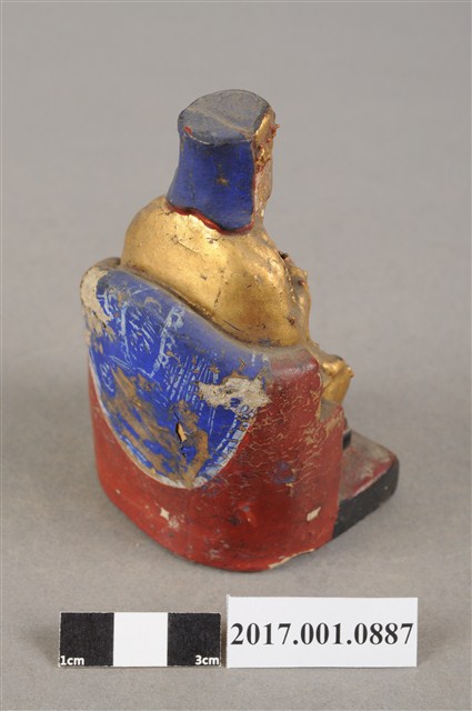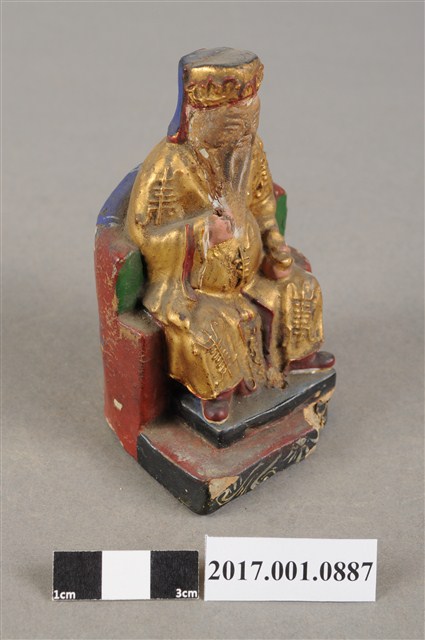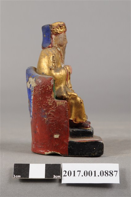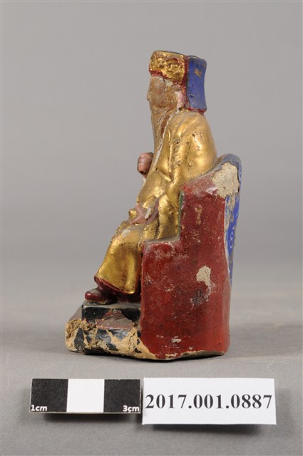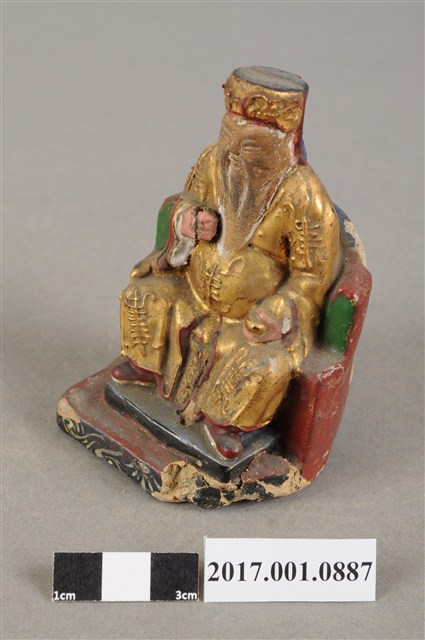 1.本件福德正神為磚燒,表面安金彩繪而成。尺寸嬌小,造型質樸。福德正神頭戴東坡巾,臉部顏色褪去,神情慈祥穩重,蓄有白色及胸鬍鬚,面容和藹可親。福德正神身穿金色壽字長袍,雙肩、雙膝與腹部都有壽字裝飾,左手持元寶置於左膝上,右手似持拐杖,拐杖已遺失,端坐於紅色圈背椅上,座椅批藍色坐布。臺座繪有草花紋飾,臺座左側部分破損斷裂。神像臺座留有一小通氣孔,是為避免燒製時破裂。