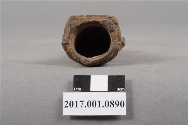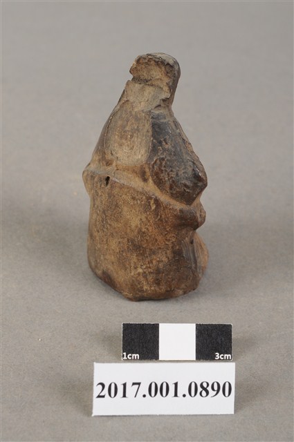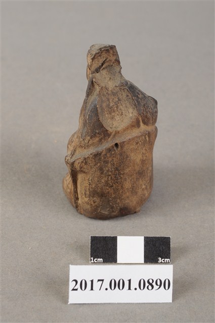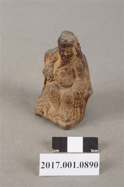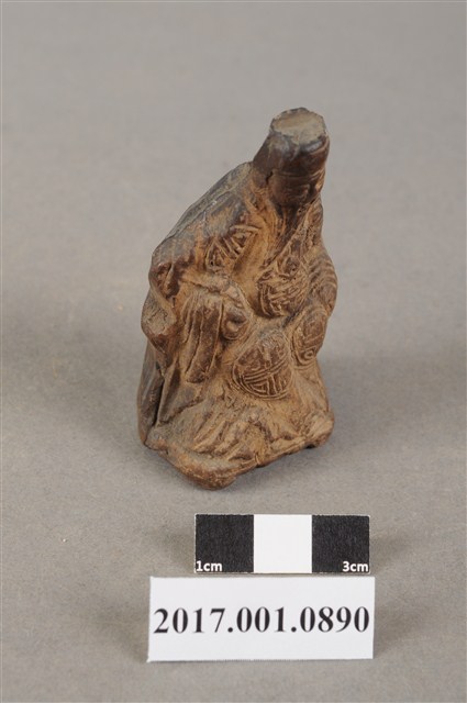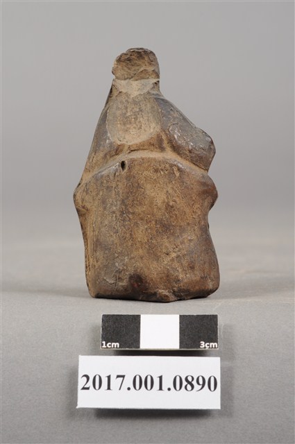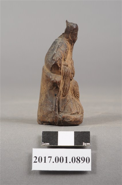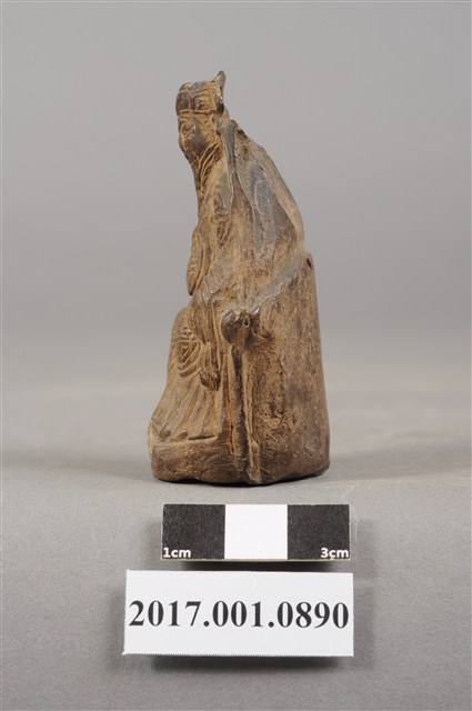 1.本件福德正神像為磚燒,顏色黝黑。神像造型嬌小古樸。福德正神頭戴方巾,偏頭微笑,臉頰飽滿,笑容可掬,神態和藹可親,五官雕刻十分精細生動,並蓄有及腹長髯。福德正神身穿壽字長袍,雙膝、雙肩與腹部都有團壽紋飾,側坐於圈背椅上,長袍衣褶生動流暢,右手持如意,左手放於左膝上,雕工精細。神像底部中空,是為避免磚燒過程爆裂。