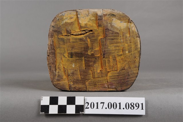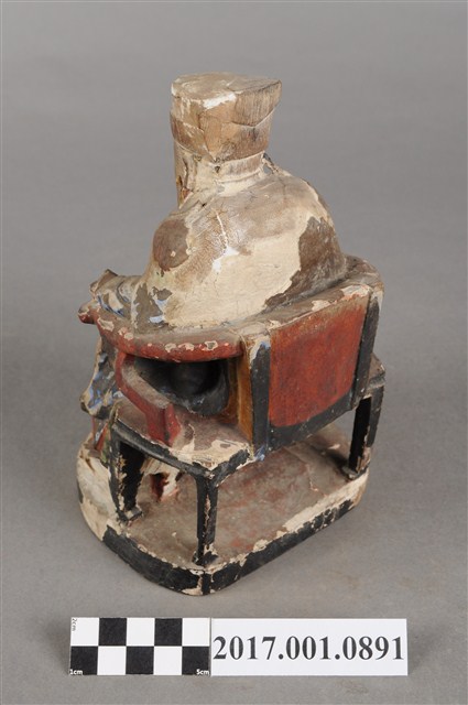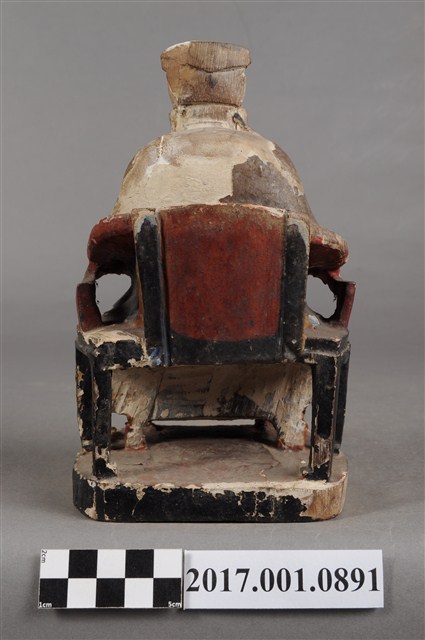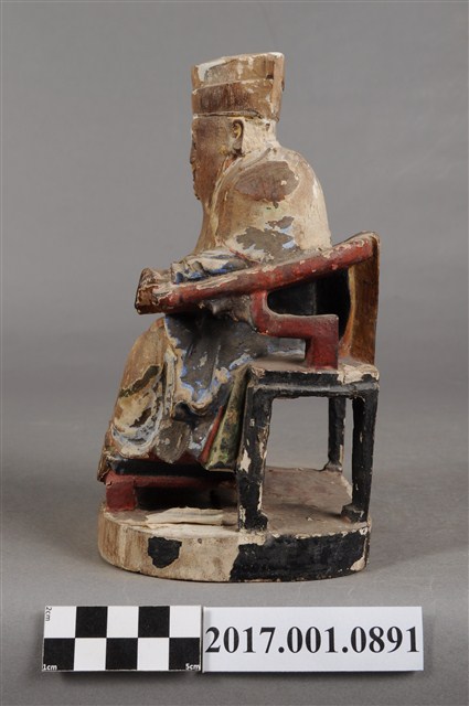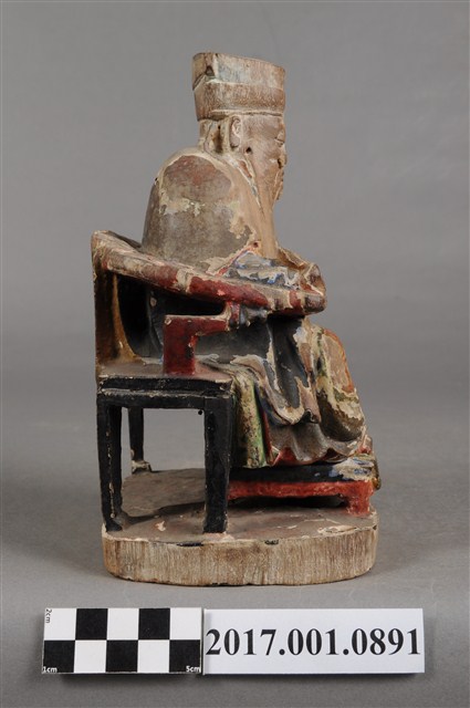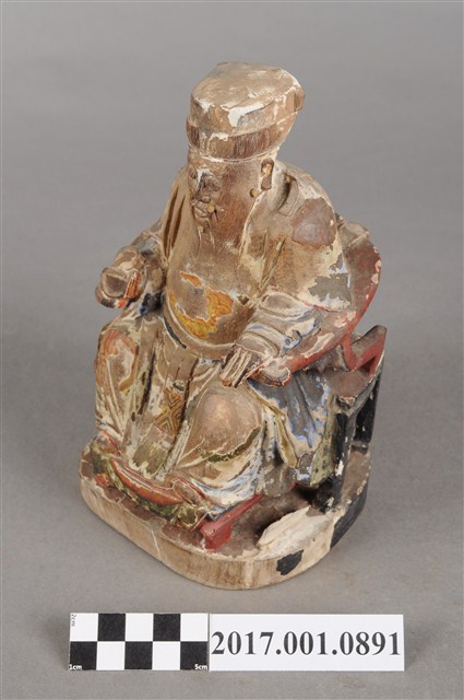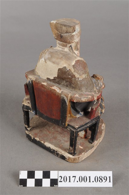 1.本件福德正神像以木雕製作,粧佛已除去,身體稍有部分彩繪層可供辨識。福德正神頭戴忠靖冠,雙眼垂視,嘴蓄長髯,神情安詳。福德正神造形呈現貴字體姿態,身穿壽字長袍,長袍彩繪大半脫落,仍可看出腹部彩繪紋路與右膝之團壽紋飾。福德正神端坐於紅色椅背、黑色椅腿的圈背椅上,右手持元寶,左手放置於圈背椅扶手處,雙腳踏於踏几上。