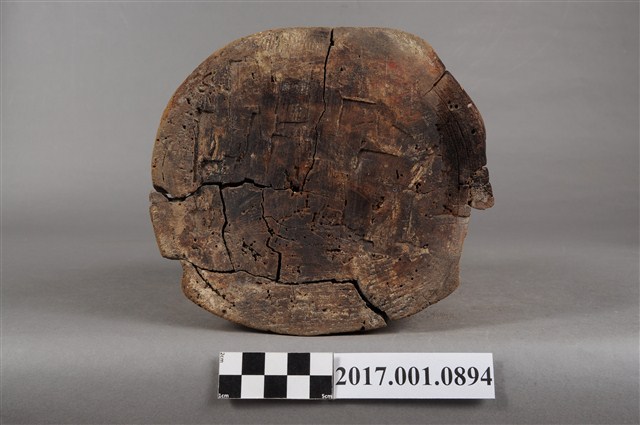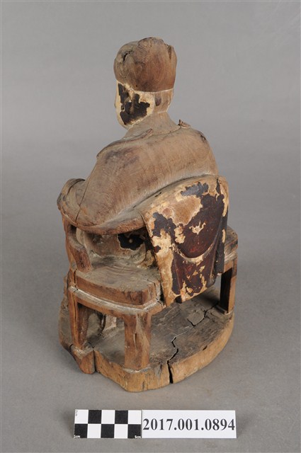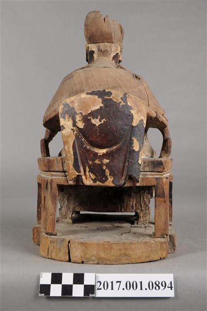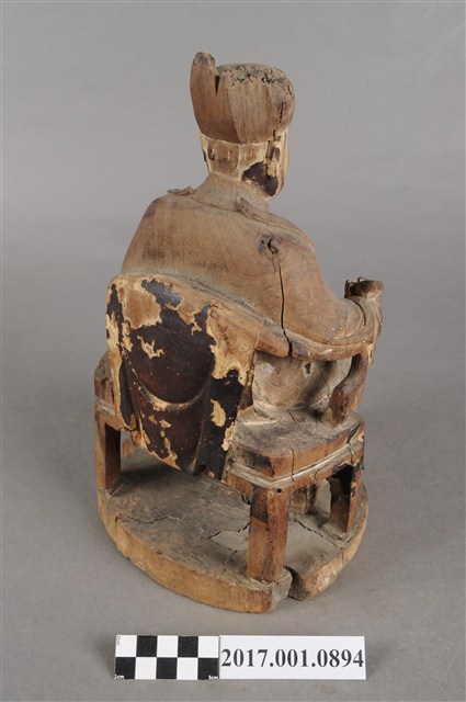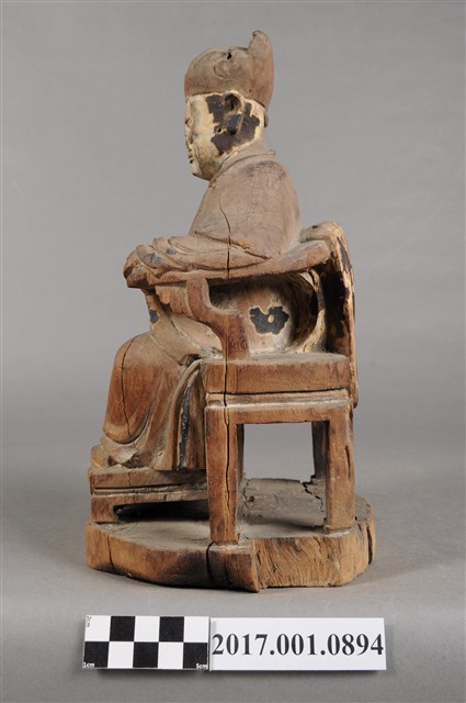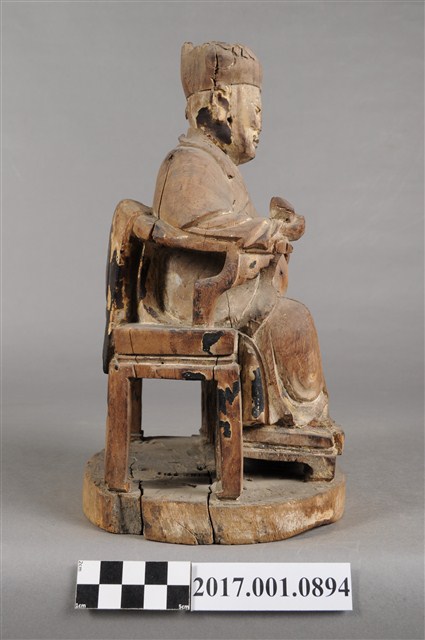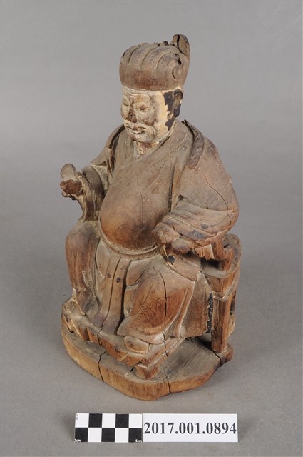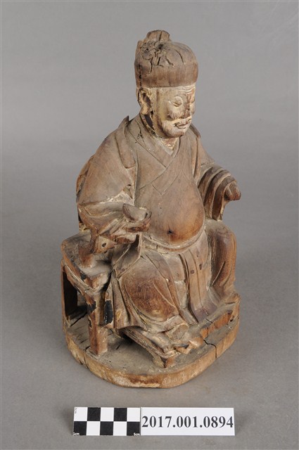 1.本件福德正神像以木雕製成,粧佛已除去。福德正神頭戴忠靖冠,雙眼垂視,鼻頭削落,臉頰豐厚,嘴部有植鬚孔,鬍鬚已掉落,神情莊嚴。福德正神造形呈現貴字體姿態,身穿長袍,端坐於圈背椅上,右手持元寶,左手按於座椅扶手,雙腳踏於踏几上。