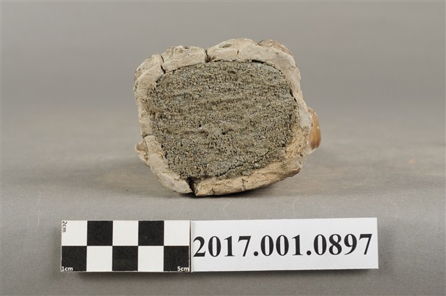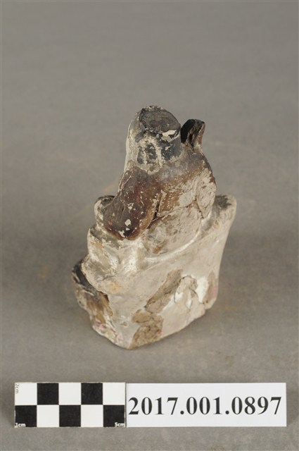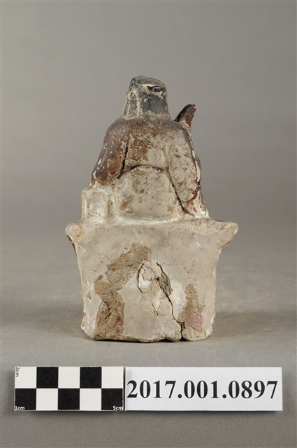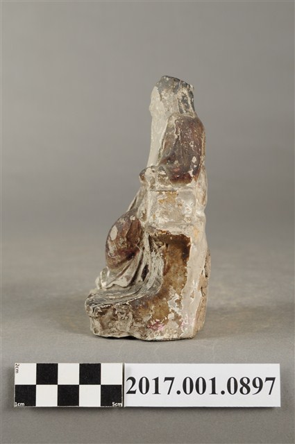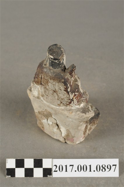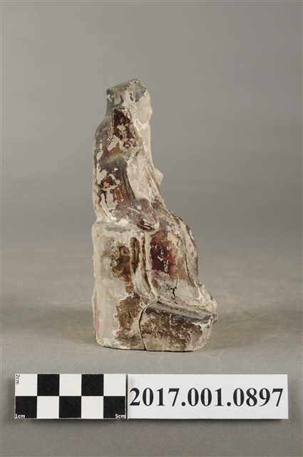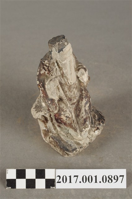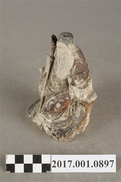 1.本件福德正神像以泥塑製成,粧佛已除去,留下灰白的底色。福德正神側端坐於岩座上,頭戴方巾,身穿長袍,採安字體坐姿。福德正神臉部斑白,面帶微笑,抬頭仰望天空,臉頰豐腴,蓄有長髯,左手持元寶,右手持拐杖,身體倚靠於岩石上,整體姿態優雅自然。