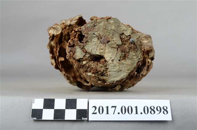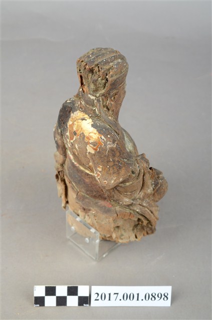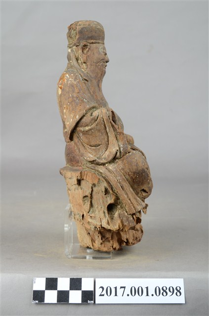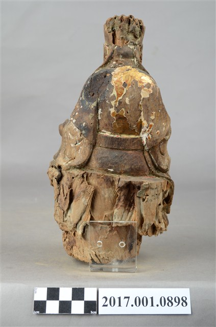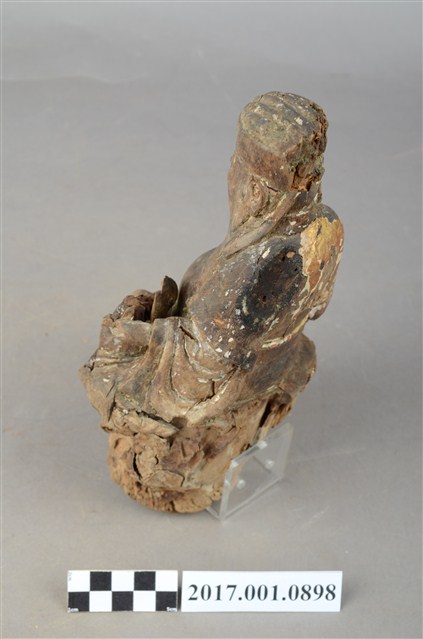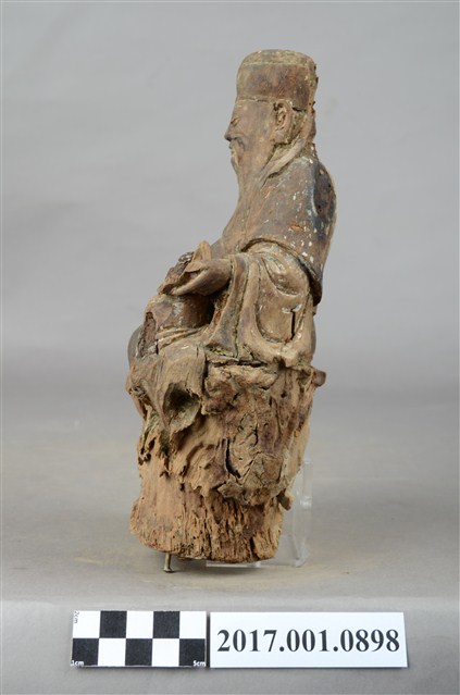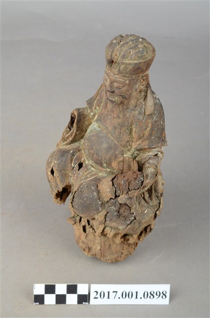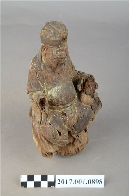 1.本件福德正神像為木雕,粧佛已除去。福德正神頭戴忠靖冠,臉頰飽滿,表情莊嚴,面帶微笑,蓄有長髯。神像端坐於岩座上,身穿長袍,不加線條修飾,右手高抬,似有持物但手掌斷裂無法得知,左手掌亦斷裂,神像採安字體坐姿,下半身左側有剝落現象,右側有蟲蛀孔。雙腳已經削落遺失。神像臺座上有一塊木頭支撐,並釘有兩枚鐵釘。