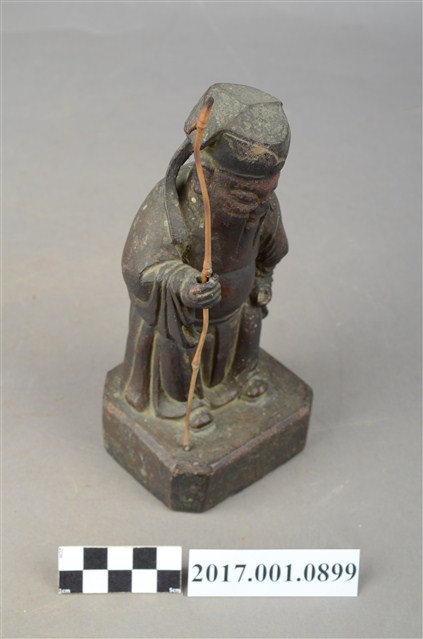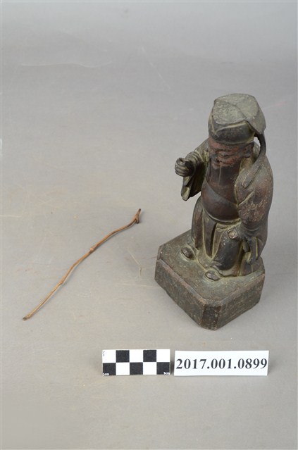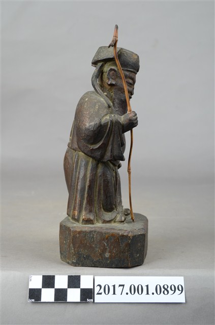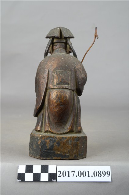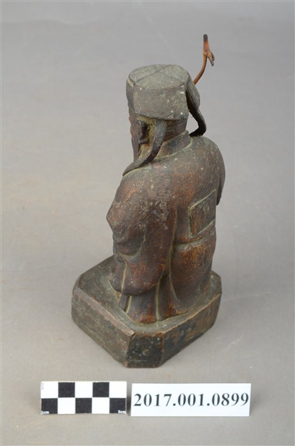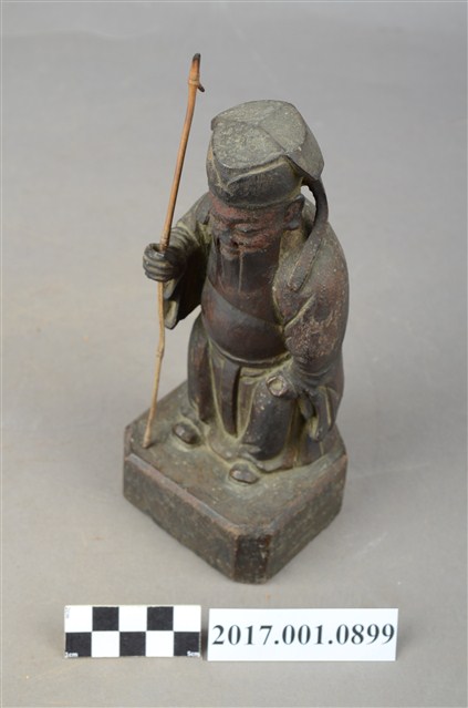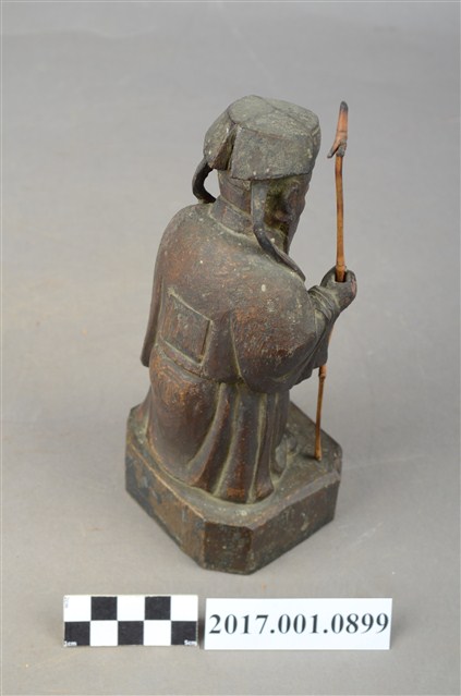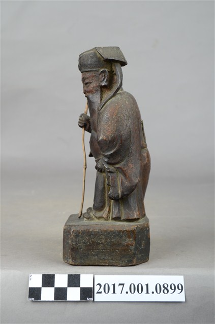 1.本件福德正神像以木雕並施以彩繪製成,神像以三頭身比例雕刻。神像背部開有方形入神洞,封榫尚存。福德正神頭戴東坡巾,臉色紅潤,雙頰豐腴,雙眼微閉,面帶微笑,蓄有長髯,神情安詳。福德正神身穿長袍,站立於臺座之上,右手持細拐杖,左手握拳置於左膝處。
