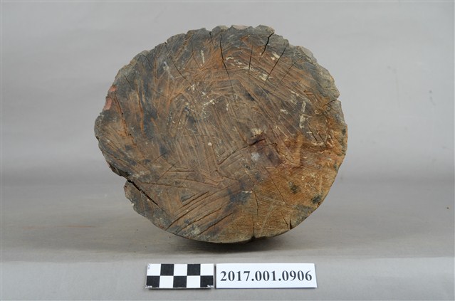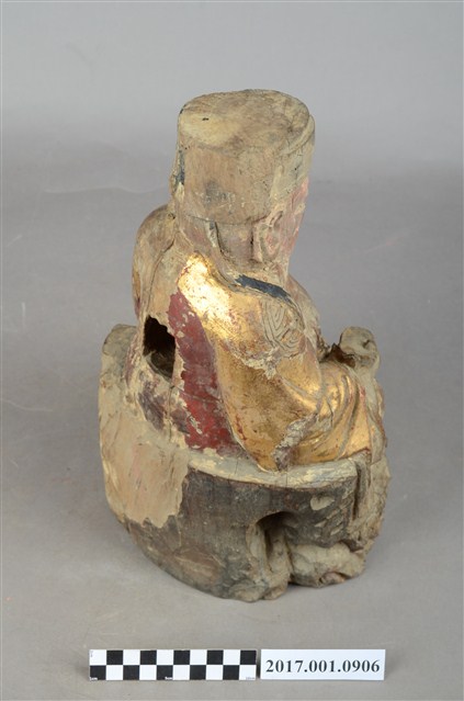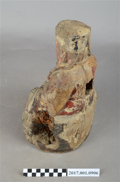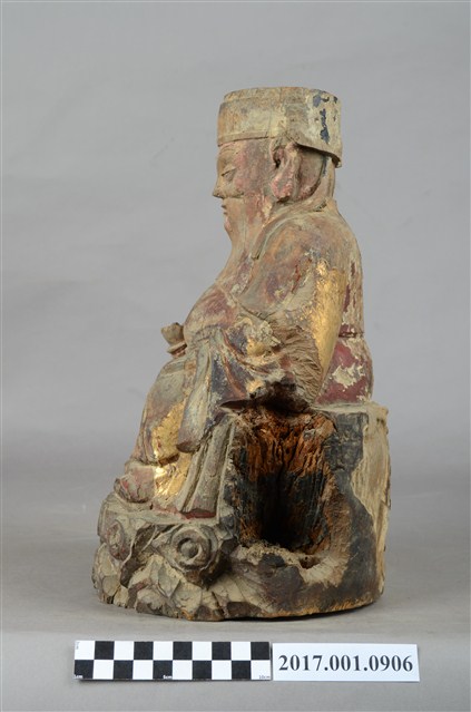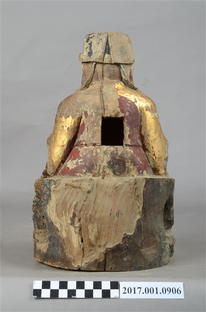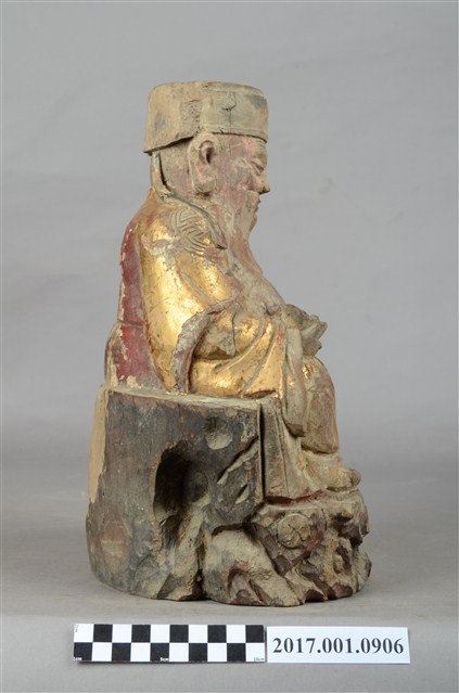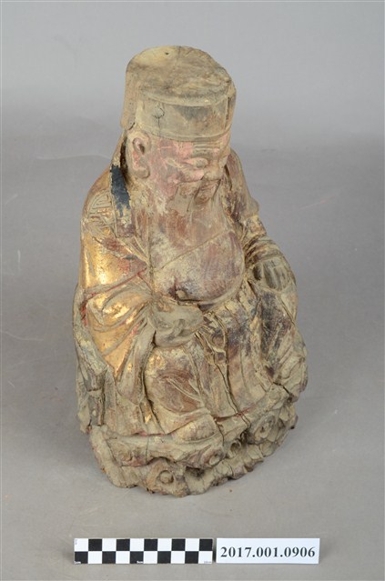 1.本件福德正神像以木雕彩繪製作,粧佛已除去。神像背部開有方形入神洞,封榫佚失,內部物件已取出。福德正神頭戴方巾,圓臉長耳,五官立體,雙頰飽滿,鼻頭凸起,嘴蓄長髯,面帶微笑顯得和藹可親。福德正神造形呈現貴字體端坐岩座上,身穿長袍,右手持元寶,左手擺放於左膝上,衣褶線條流暢,長袍彩繪大半脫落。背部可看出底部紅色。