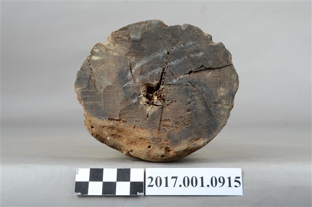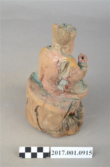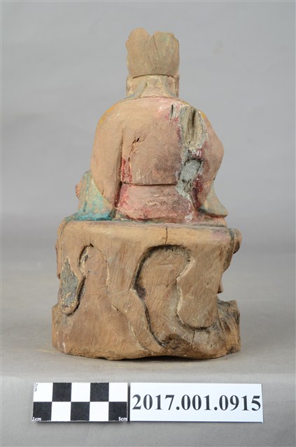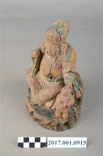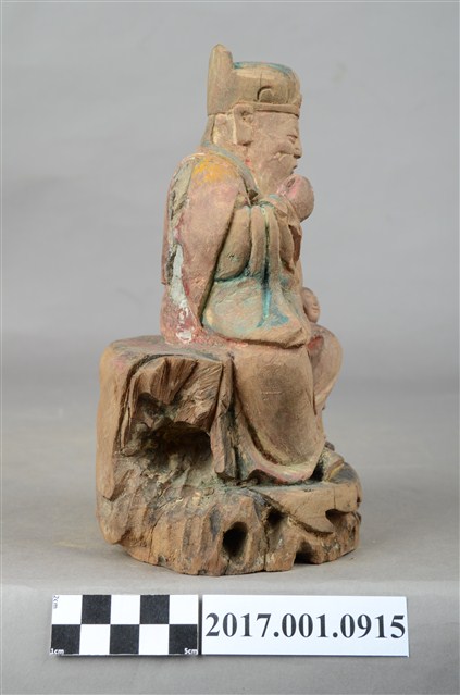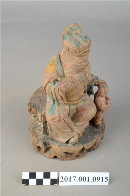 1.本件福德正神以木雕製成,粧佛已除去。福德正神頭戴忠靖冠,臉型圓潤,雙頰有肉,表情和藹可親。福德正神身穿長袍,表面彩繪剝落,尚可辨識長袍為青色。福德正神以安字體姿態坐於岩座之上。左手扶於童子頭部,右手則似乎握有拐杖。童子面貌清秀,頭髮結髻,雙手捧元寶,抬頭望著福德正神呈現孺慕之情。