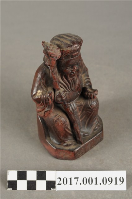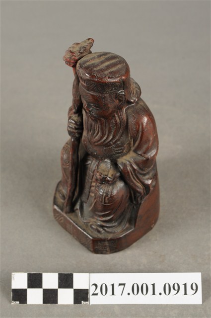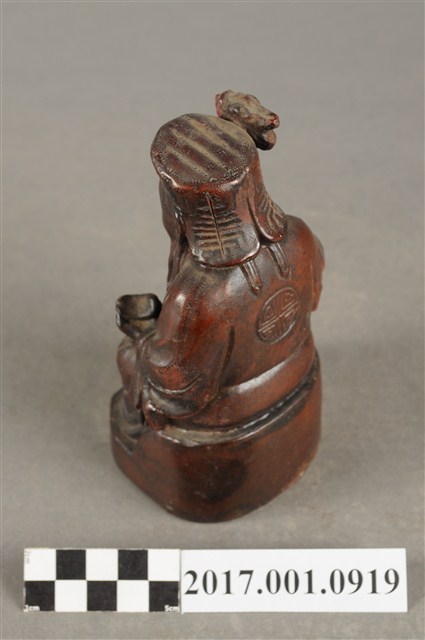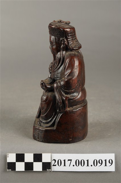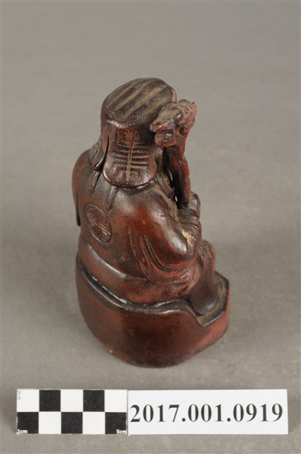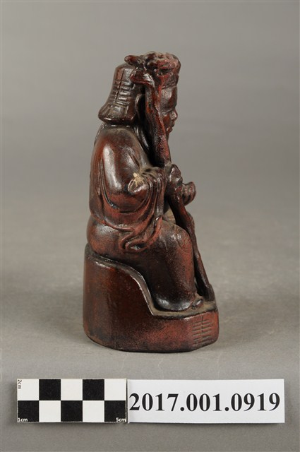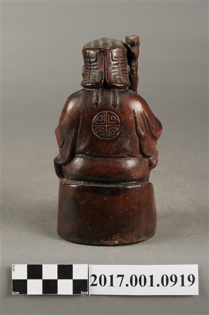 1.本件福德正神像為磚燒,表面上釉顯得光滑,神像造型古樸。福德正神頭戴方巾,上有三角形紋飾。福德正神臉頰飽滿,雙目垂視,笑容可掬,神態和藹可親,並蓄白色鬍鬚。福德正神身穿壽字長袍,雙肩、雙膝與背後處有團壽紋樣,腹部則為太極紋,長袍劍帶飾有壽字。福德正神右手持拐杖,左手持元寶,端坐於臺座上,福德正神神袍的衣褶雕刻簡潔樸素。神像臺座處雕有壽字裝飾。底部中空是為避免燒製過程爆裂。