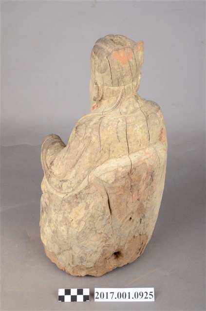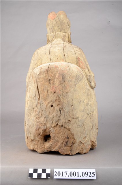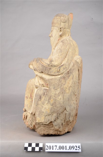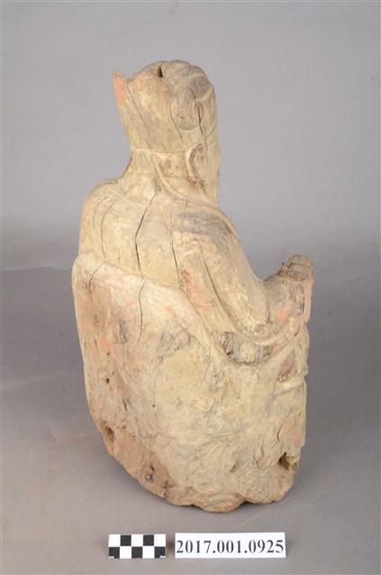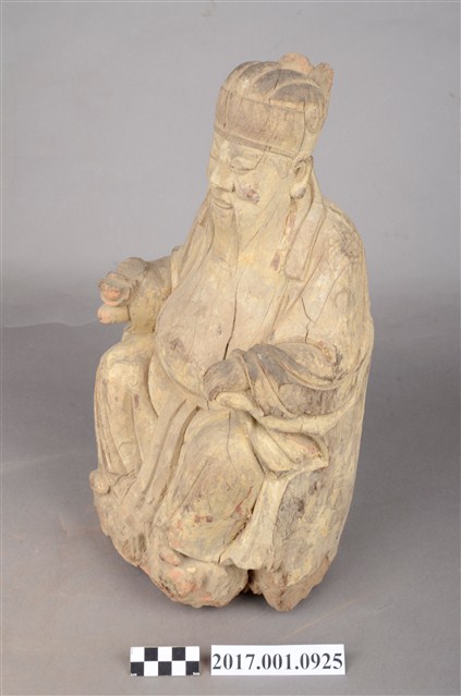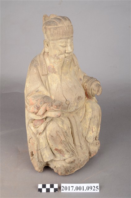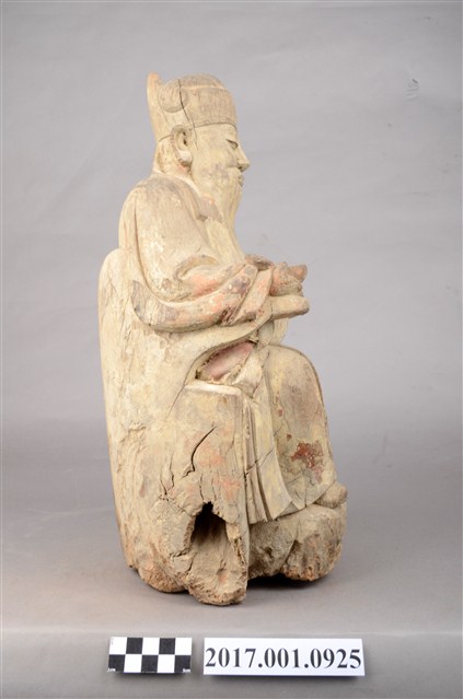 1.本件福德正神像為木雕製成,表面安金彩繪已除去。福德正神頭戴忠靖冠,圓臉大耳,臉頰豐腴,蓄有長髯,雙目垂視,和藹可親。福德正神身穿長袍呈貴字體姿態,端坐於圈背椅之上,長袍無額外線條裝飾,衣褶線條呈現自然,右手持握元寶,左手擺放於座椅扶手上。