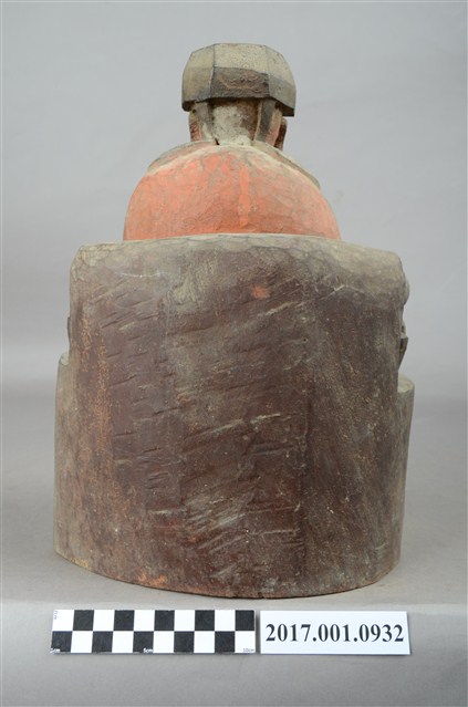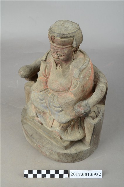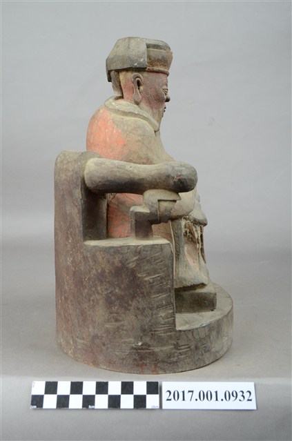 1.本件福德正神像以木雕製成,並施漆彩繪。整體造型穩重莊嚴。福德正神頭戴方巾,兩頰有肉,耳垂較長,蓄有長髯,為富貴長壽的象徵,福德正神雙眼垂視,神情慈祥。福德正神身穿佛青色壽字長袍,端坐於圈背椅之上。長袍雙肩與雙膝皆有團壽字紋樣。福德正神雙手放置於腹部採抱袖體姿態,雙手互握藏於袖中,長袍衣褶線條自然。