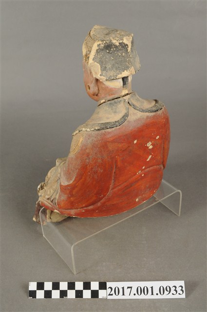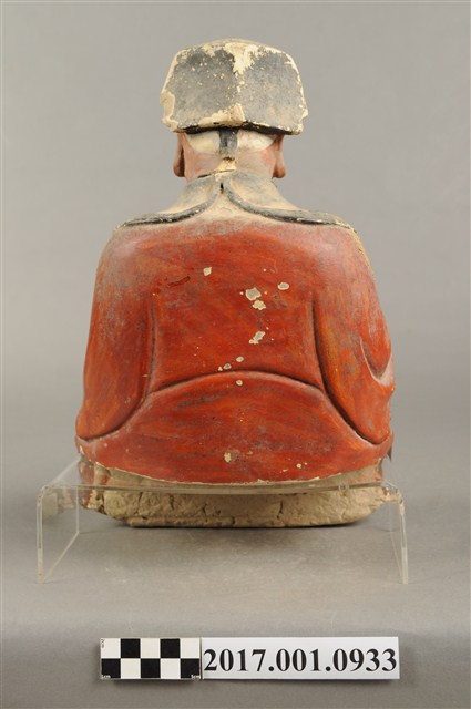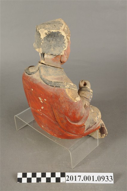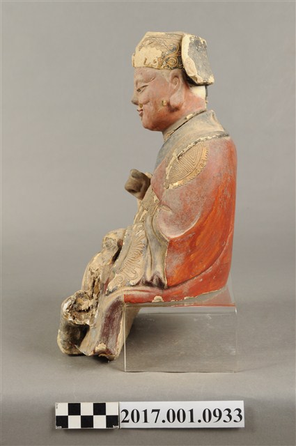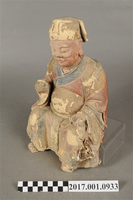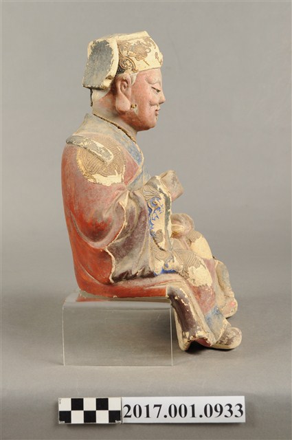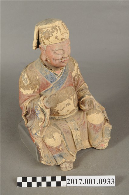 1.本件福德正神像為泥塑,表面施以漆線安金與彩繪而成。粧佛部分脫落。福德正神頭戴忠靖冠,飾有漆線紋飾。福德正神頭微向右側偏擺,臉部神情栩栩如生,臉色紅潤,雙頰豐厚,長耳垂,嘴部有植鬚孔,鬍鬚已經掉落,雙眼垂視,面帶微笑,神態安詳。福德正神採脫椅技法雕塑,身穿朱紅色長袍,衣袖處以藍色花草紋樣裝飾,長袍雙肩與雙膝處以漆線描繪團壽圖樣,腹部則為仙鶴圖案。福德正神雙足穿黑色雲頭履。福德正神右手疑似持握拐杖,左手原先牽著一名童子,童子已經掉落只留下右腳黏於福德正神身邊。