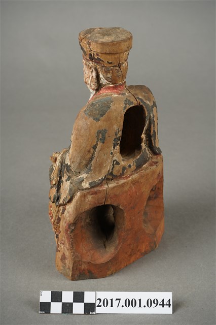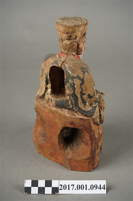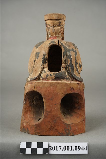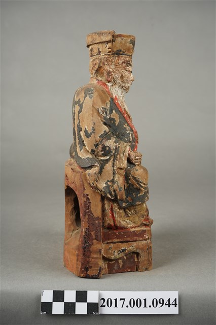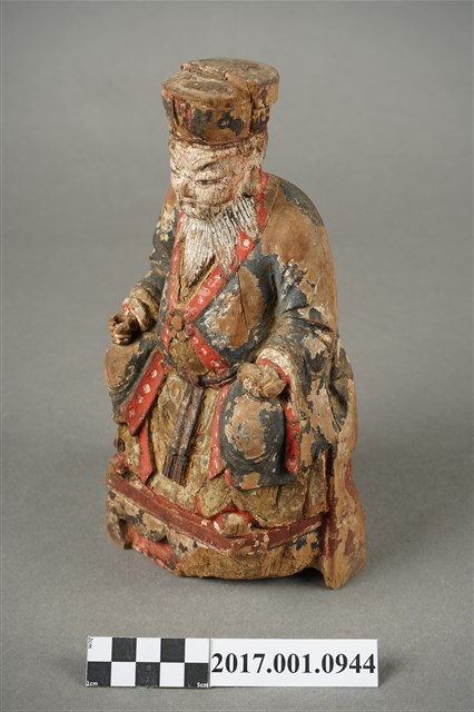 1.本件福德正神像為木雕製作,表面施以彩繪,色彩鮮豔。神像背後有一橢圓入神洞,封榫佚失,內部物件已取出。福德正神臉色蒼白,雙目炯炯有神,鼻頭高,續有白色長髯,神情莊嚴。福德正神頭戴巾,身穿佛青色長袍,長袍滾邊彩繪紅底白色花草紋,神像呈貴字體姿態,整體色彩搶眼。福德正神端坐於臺座,雙足穿雲頭履踏於椅几上。福德正神左手握持元寶,右手握拳放置於右膝上。
