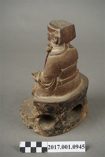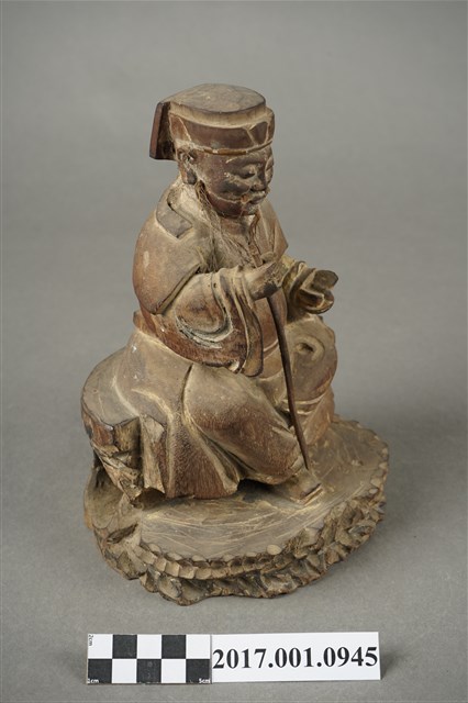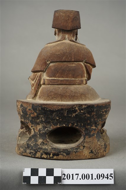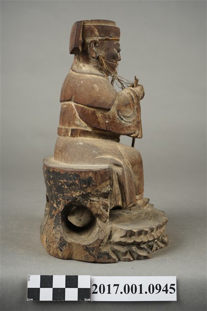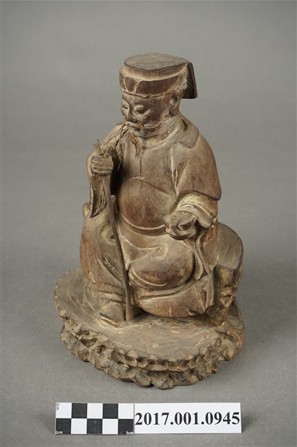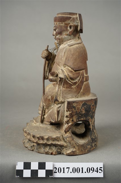 1.本件福德正神像為木雕彩繪神像,表面彩繪已除去。福德正神頭戴東坡巾,兩眼垂視,鼻頭凸起,臉頰豐厚,面帶微笑,嘴部孔植有鬍鬚,表情安詳。福德正神身穿長袍,左手持元寶,右手平握持拐杖,拐杖頂端已折斷。足部交叉身形姿呈安字體,端坐於岩座上。