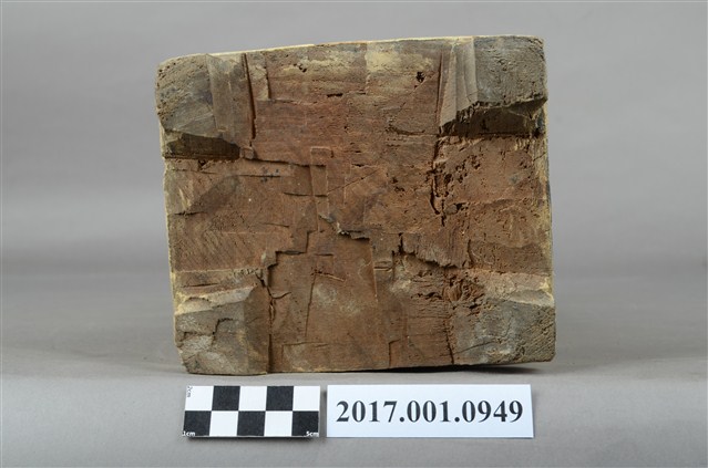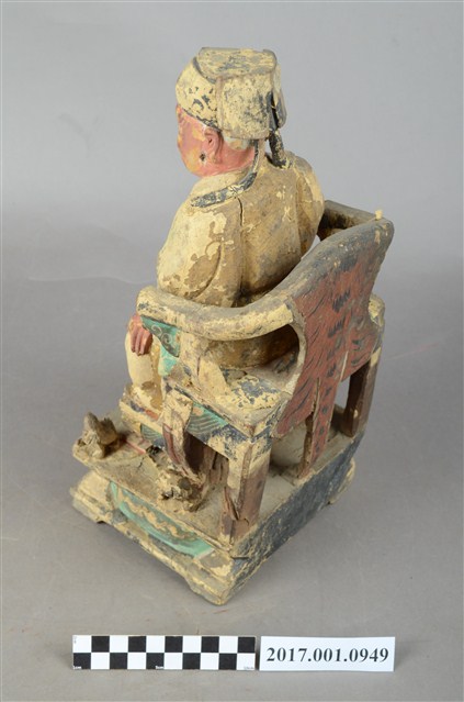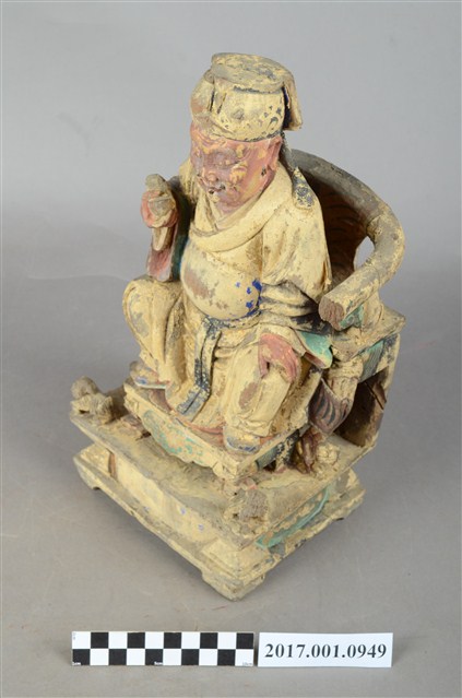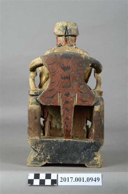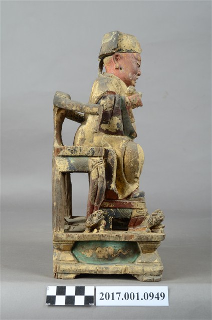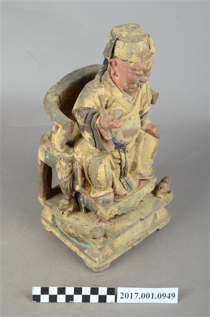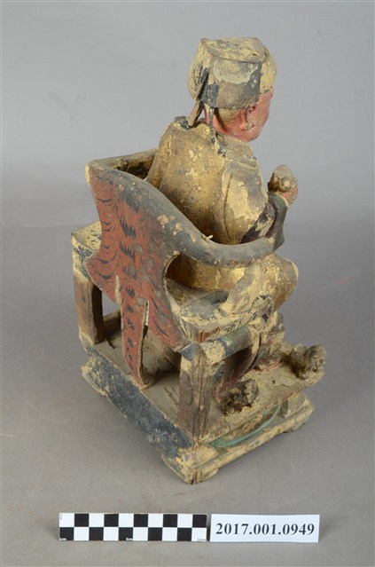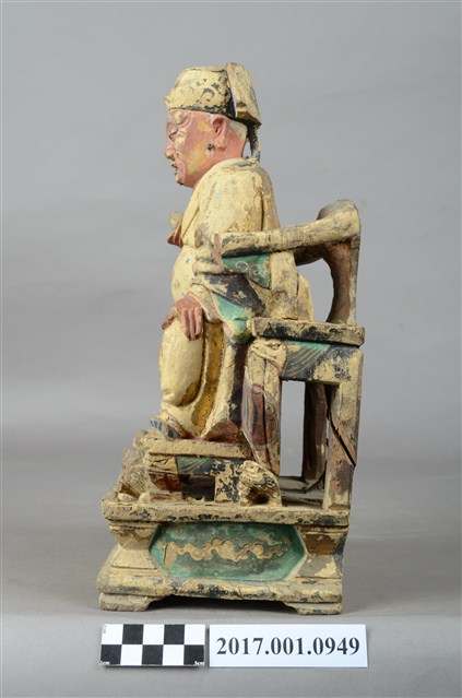 1.本件福德正神像以木雕製作,表面彩繪安金大部分脫落。福德正神五官立體,臉色紅潤,雙目垂視,臉頰豐腴,面帶微笑,嘴邊有植鬚孔,神態和藹可親。福德正神頭戴東坡巾,身穿黃色長袍,呈貴字體姿態端坐圈背椅,雙足踏於椅几上。圈背椅被飾有虎皮,臺座四角有四隻金獅,顯示其尊貴。長袍紋飾已遭除去不清,為可從顏色判斷為青色與黃色。福德正神右手握持元寶,左手放置於左膝上。臺座飾有綠底黃色雲紋。圈背椅扶手出頭削除。