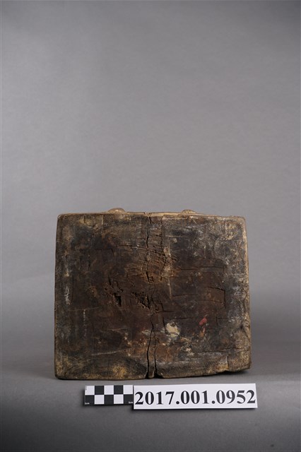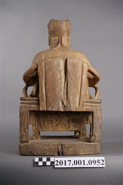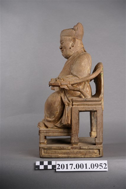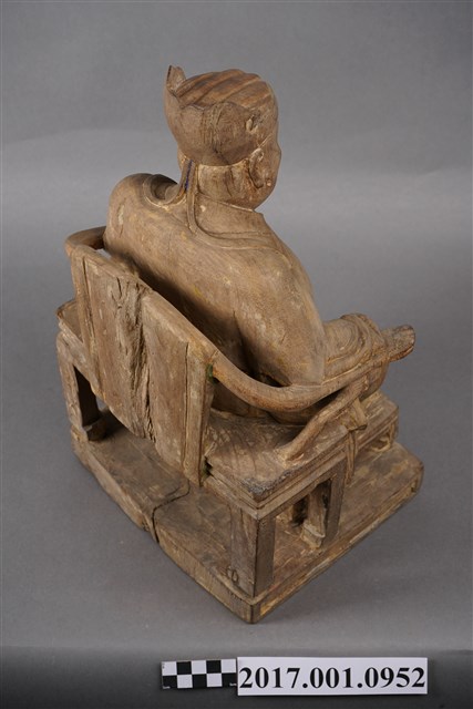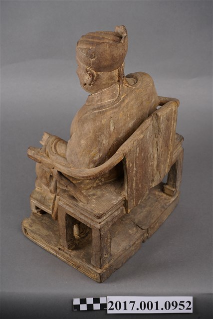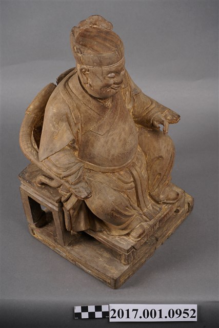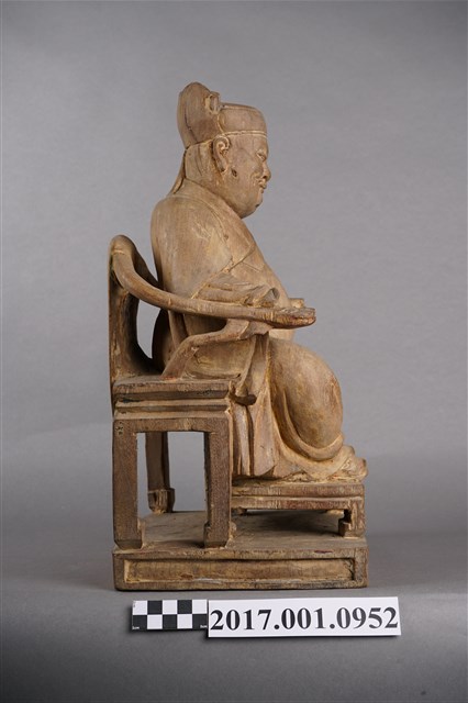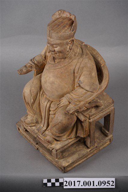 1.本件福德正神像以木雕製作,表面彩繪安金已除去。福德正神五官立體,鼻頭凸出,細目垂視,臉頰特別豐腴,面帶微笑,嘴部有植鬚孔,為富貴之象徵。福德正神頭戴忠靖冠,身穿長袍,呈貴字體姿態端坐圈背椅,雙足踏於椅几上。長袍粧佛已經洗去,衣褶線條自然。右手手掌遺失,手臂處留一孔。