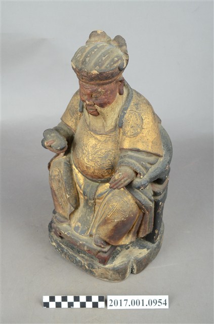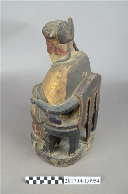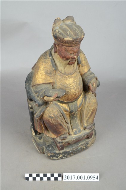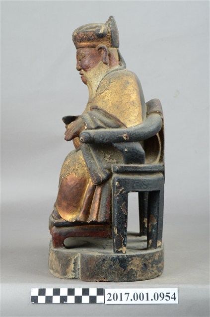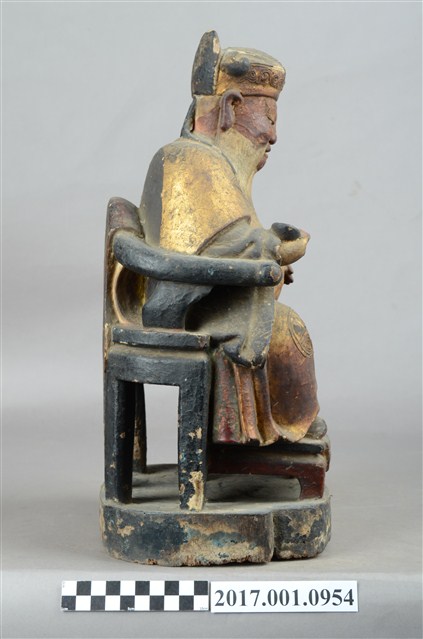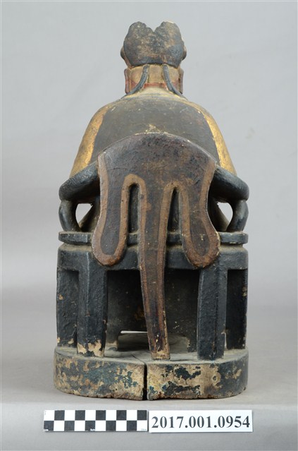 1.本件福德正神像以木雕製作,表面施以彩繪安金。福德正神臉色紅潤,雙目垂視,鼻頭高凸,臉頰豐腴,面帶微笑,神態和藹可親。福德正神頭戴忠靖冠,身穿金色壽字長袍,呈貴字體姿態,端坐圈背椅,圈背椅背有虎皮雕刻,雙足踏於踏几上。長袍雙肩與雙膝處有漆線團壽紋飾,腹部則為仙鶴紋飾。福德正神右手握持元寶,左手放置於座椅扶手上。