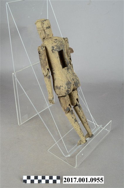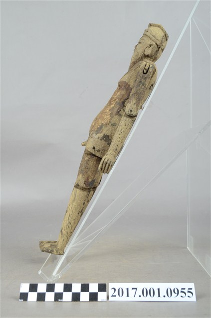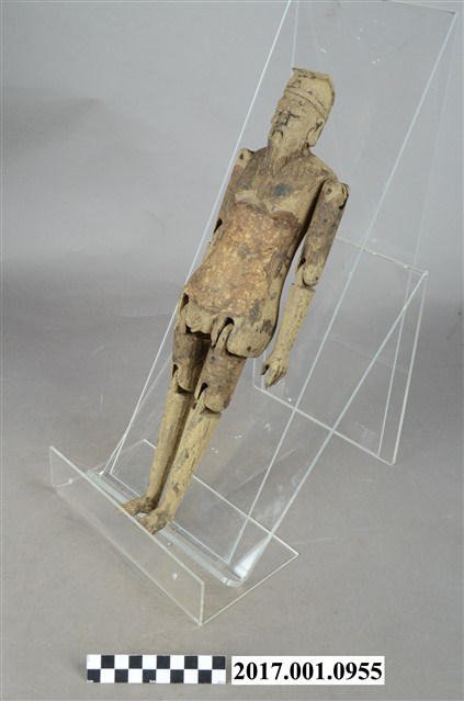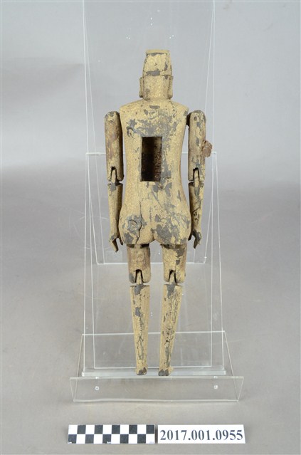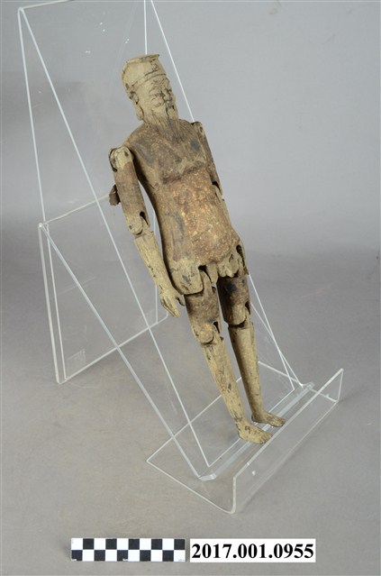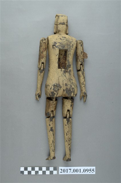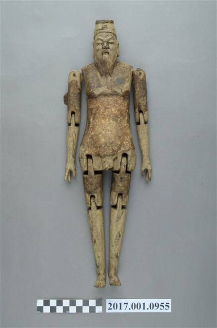 1.本件木雕軟身福德正神像,背面開有長方形入神洞,封榫佚失,內容物件已取出。福德正神頭戴圓巾,雙眼垂視,鼻頭高起,蓄有長髯,神情嚴肅。神像有關節可以活動,身體部胸膛隆起,雙腳跣足,胸與腹部有以墨筆繪有鸚鵡線圖。下體則有雕塑出男性生殖器。