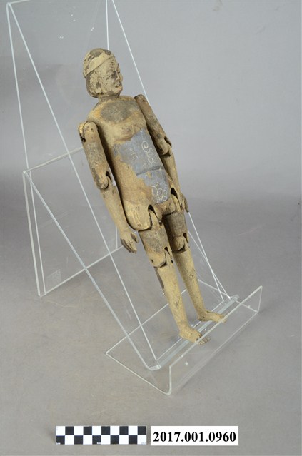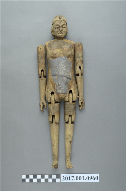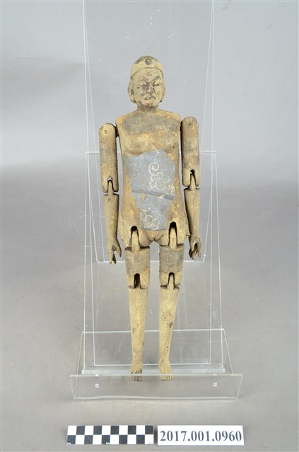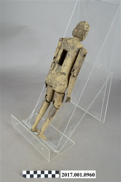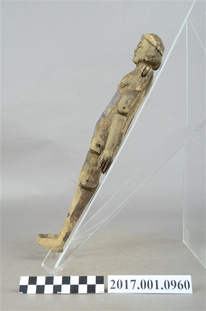 1.本件木雕軟身福德正神夫人像,背面開有長方形入神洞,封榫佚失,內容物件已取出。頭戴頭巾,白髮蒼蒼,雙眼垂視,神情和藹安詳。神像有關節可以活動,身體胸部隆起,有女性特徵,雙腳跣足,腹部以青色彩繪雲紋肚兜。下體則有刻痕代表女陰。右小腿關節斷裂掉落。