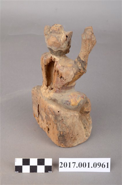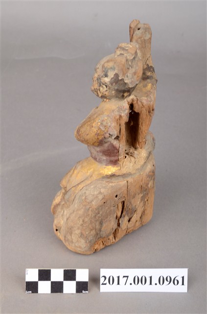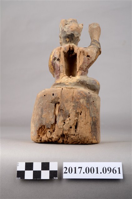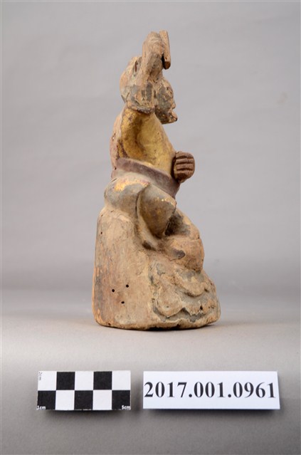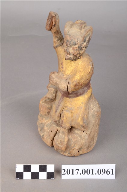 1.本件木雕雷公像採坐姿,端坐石臺上,表面施以彩繪安金飾成。雷公長耳鳥嘴,雙眼凸出,背後開有方形入神洞,封榫佚失,入神物已取出。雷公頭戴小冠,身穿長袍,繫紅色腰帶,左手橫舉胸前,持物遺失,右手持物高舉過頭,作捶打貌。腳穿皂靴,左腳踏於岩座,右腳翹起踮於岩石上。臺座作岩石貌高方臺。
