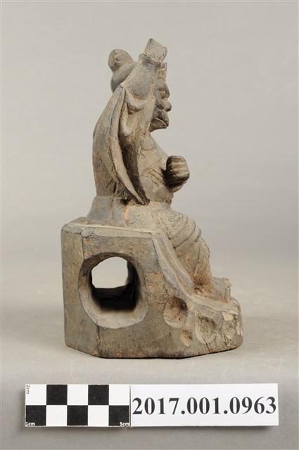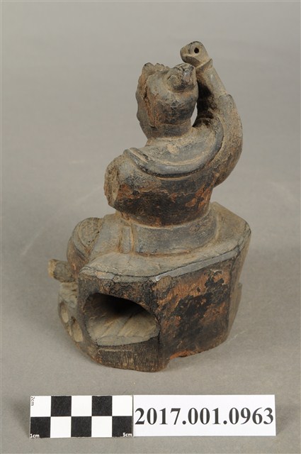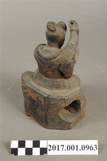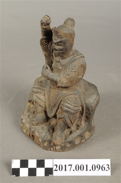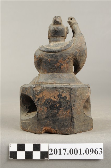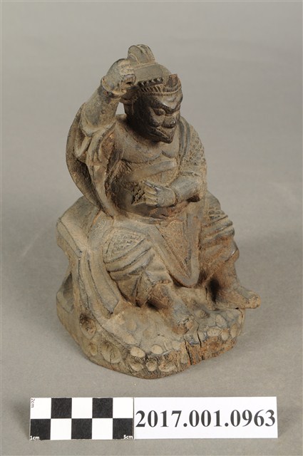 1.本件木雕雷公像,作坐姿姿態,坐在岩座上,表面施作塗裝粧佛技法,漆面褪去。雷公呈現精怪造形,耳旁鬢髮朝天,眉骨凸出,雙眼圓睜,鳥嘴。頭戴兜鍪,兜鍪上有小冠,肩頸披著披膊與護肩,腰束腰帶,護腹以腰帶固定,正面腰帶下有前擋與左右擋鎧甲,鎧甲以錦雕表現甲冑紋,雙腳穿皂靴。挺身端坐,雙手虛握,左手橫伸於胸前,右手高舉,持物已遺失。雙足垂下踏地,右腳內縮。