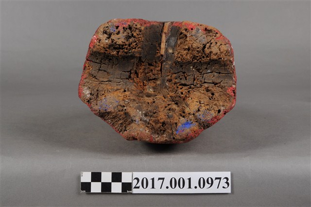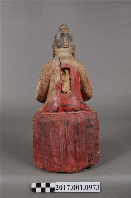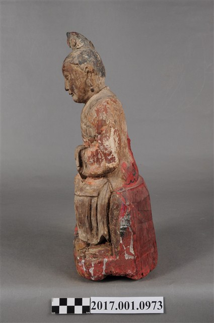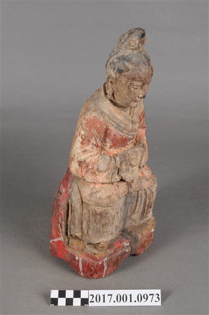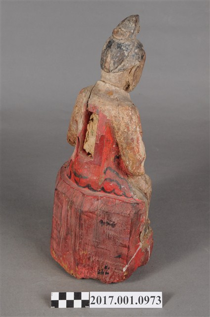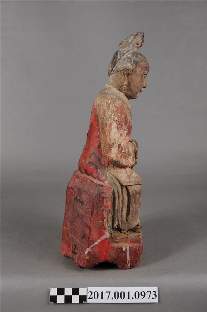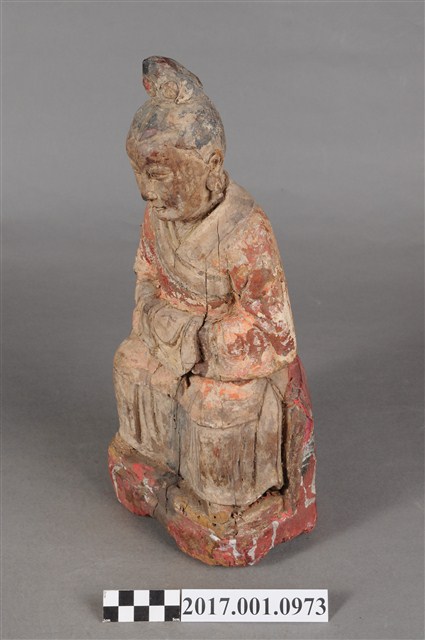 1.本件木雕碧霞元君像採坐姿,表面粧佛大面積脫落,背部有一長方形入神洞,封榫佚失,可見裡面所塞入神物。碧霞元君坐在一高臺座上,臺座底部中間略有凹槽,不平整,前有簡單雕刻,後面齊平。碧霞元君端坐,雙足自然下垂,腳著弓鞋。雙手交握於腹前,手掌隱於一方布巾之內,作持圭狀,持物已失。髮梳單髻頭戴山形法冠,雙耳戴有耳飾。身著左衽短衣長裙。