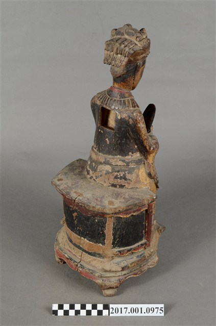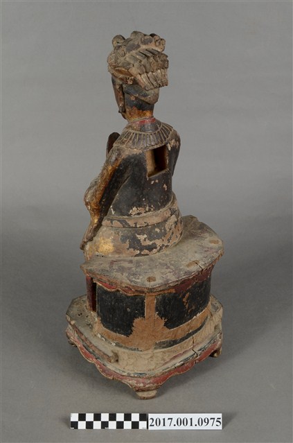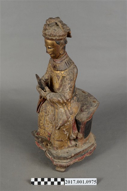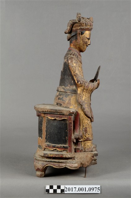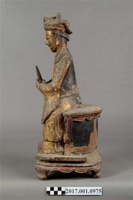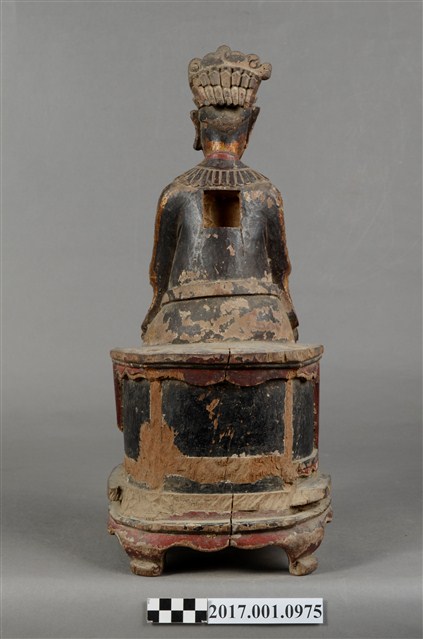 1.本件木雕碧霞元君像採坐姿,表面有安金和漆面,部分已脫落。背後有一方形入神洞,封榫佚失,不見入神物。碧霞元君坐在一張椅凳上,椅凳下的臺座懸空,四方雕刻有短几腳,前後各有裂紋與部分缺損,右前几腳已斷,釘有一鐵釘支撐。碧霞元君端坐,雙足自然下垂,腳著弓鞋。雙手手指伸直交握於胸前,左手在前,合捧一笏板。元君臉型修長典雅,雙耳長垂,右耳垂缺損,頭戴冕冠,帽冠左上角缺損。身穿袍服長裙,上有許多紋路裝飾,肩披蓮瓣雲肩、腰部束有玉帶。