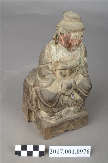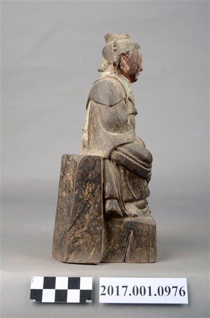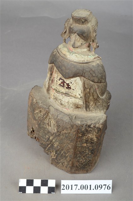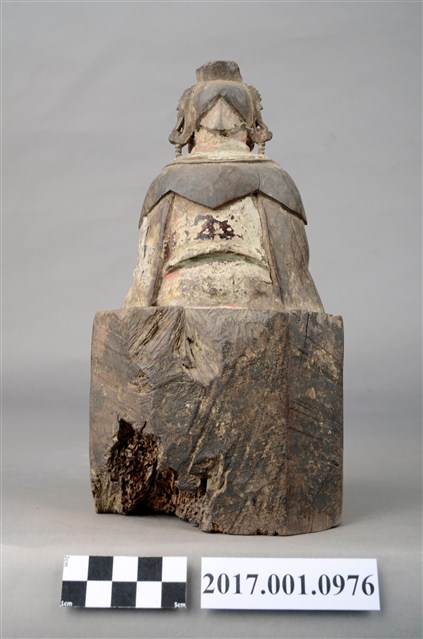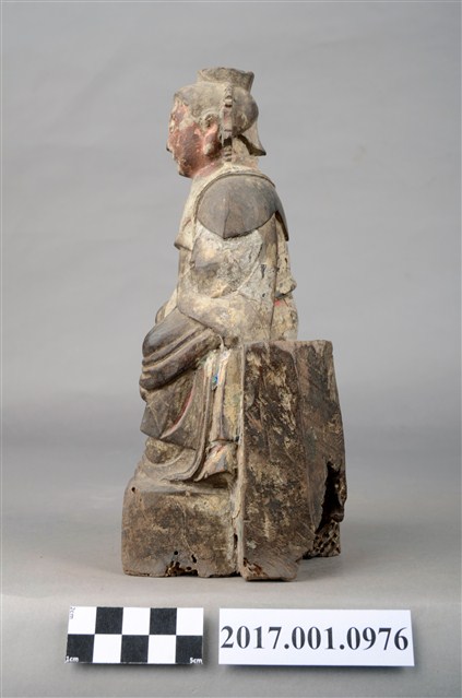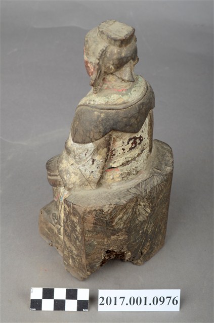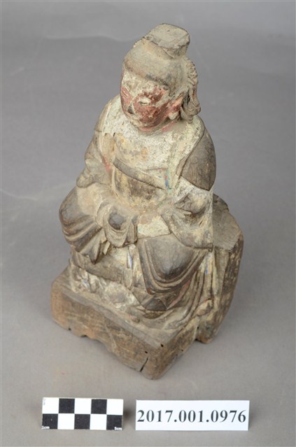 1.本件木雕碧霞元君像採坐姿,表面之漆面已脫落。碧霞元君坐在臺座上,底部平整,呈前方後圓狀,前沿下方略有雕刻裝飾,臺座右後側有一角缺損。碧霞元君端坐,雙足自然下垂,腳著弓鞋。臉型圓潤,上有紅漆,面帶微笑。頭梳圓髻,戴圓形法冠,冠飾流蘇垂於兩耳側。身著袍服長裙、雲肩,腰束玉帶,胸前束看帶。雙手交握於腹前,手掌藏於衣袖內。