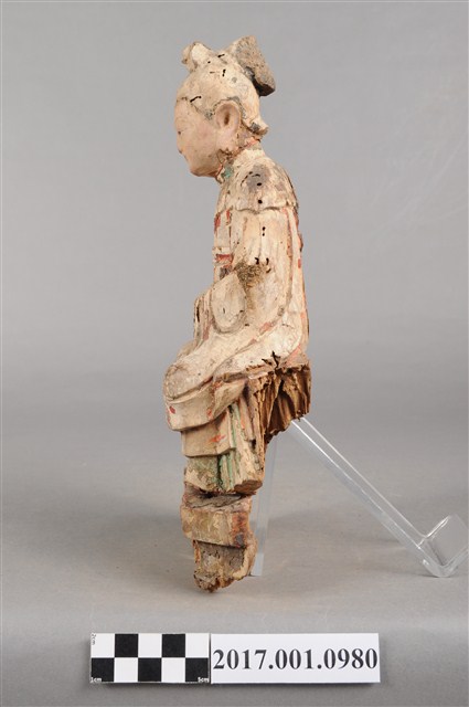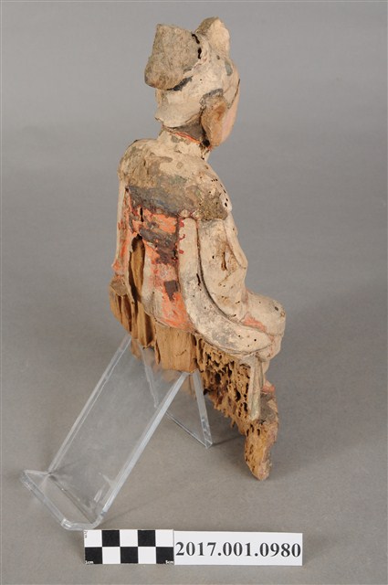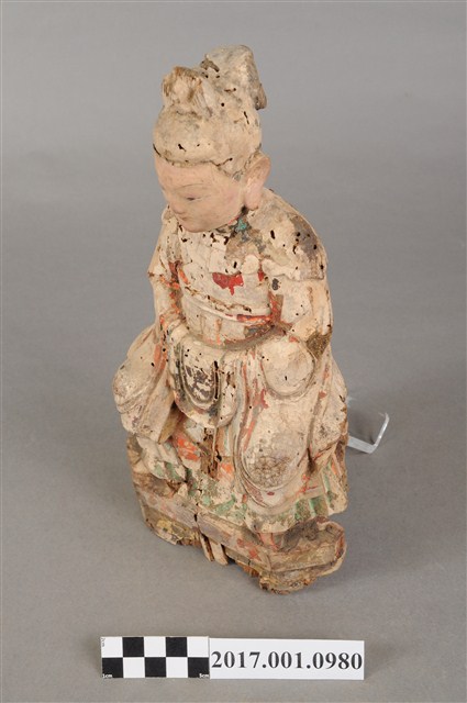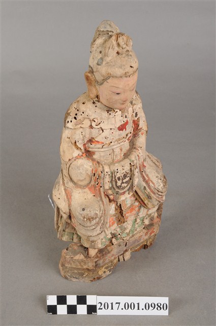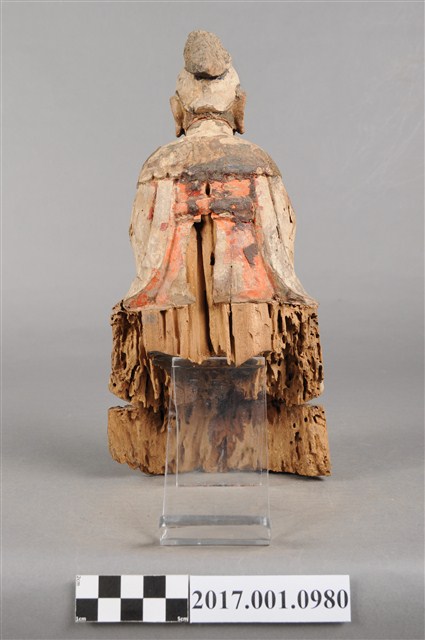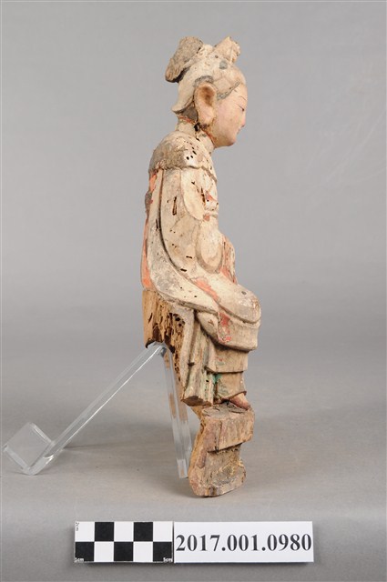 1.本件木雕碧霞元君像採坐姿造形,表面之漆面部分脫落,仍可見到鮮明的彩繪粧佛。碧霞元君坐在椅凳上,椅下接一臺座,臺座後方嚴重蛀蝕缺損,崎嶇不平。碧霞元君雙足下垂,雙手交握於腹前,手掌藏於水袖內。元君臉型圓潤,眉宇娟秀,相貌清晰,頭梳圓髻,束小冠,前端作鳳鳥髮飾。身著袍服長裙,裙裳上端繫於胸下,外罩如意雲肩。元君像自頭頂連及肩部、身體,皆有蛀蝕現象。
