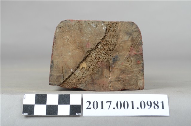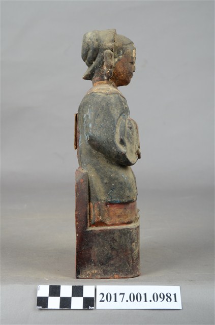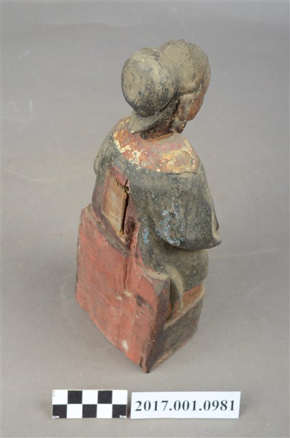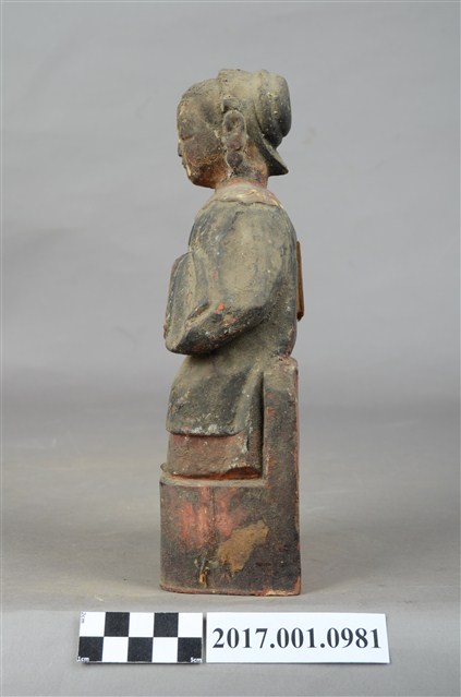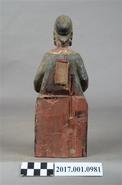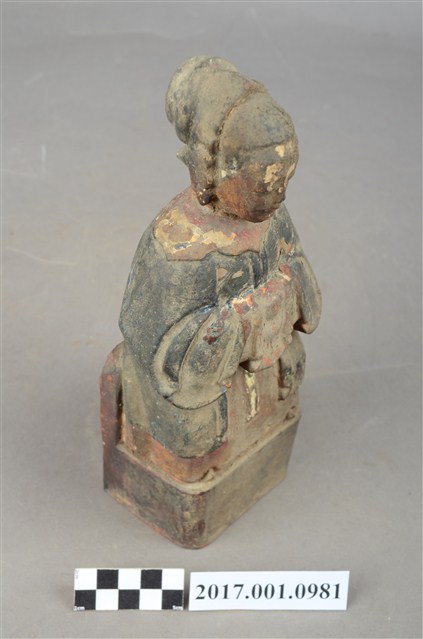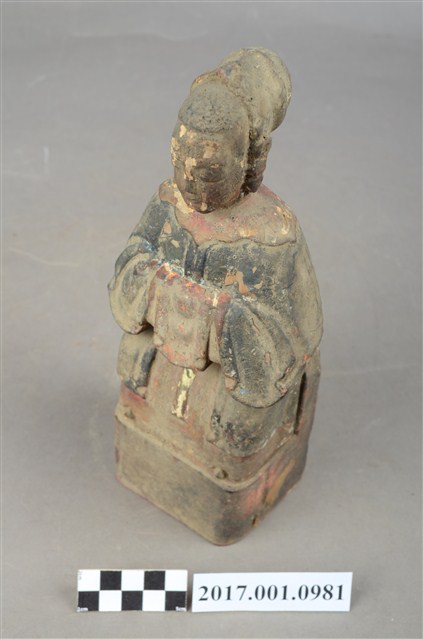 1.本件木雕碧霞元君像採坐姿造形,表面粧佛部分脫落,通身佈滿污漬,背後有一長方形入神洞,封榫尚存。碧霞元君端坐在一無背臺座上,臺座呈方形。雙足自然下垂,腳著弓鞋,踏於臺座上。雙手交握於胸前,手掌藏於水袖內。碧霞元君臉型特別修長,呈鵝蛋臉,相貌娟秀,面帶笑容,但臉上彩繪局部脫落,頭髮往後梳,盤一大圓髻。身著軟服長裙、如意雲肩,袍服以黑色為主。