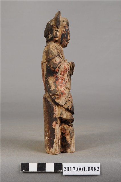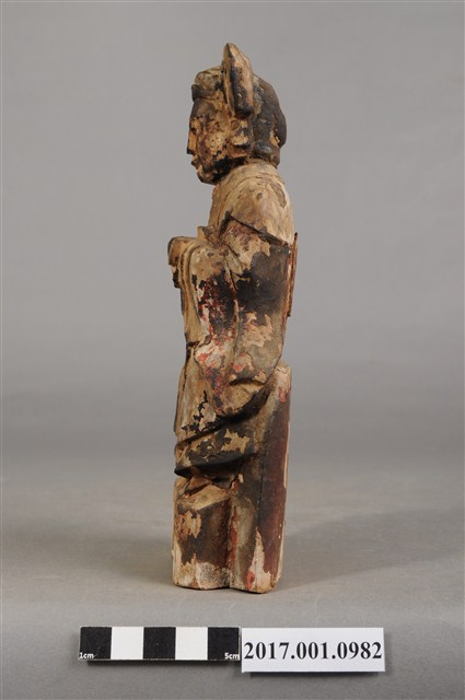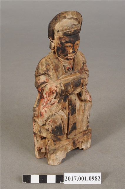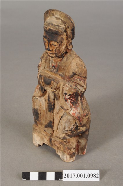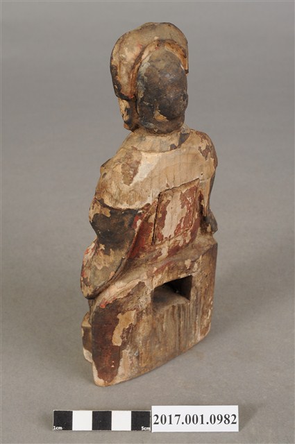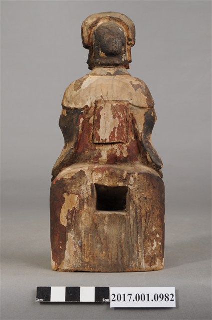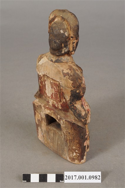 1.本件木雕碧霞元君像採坐姿造形,表面之漆面已脫落,背後有一長方形入神洞,封榫尚存。碧霞元君坐在臺座上,座前一方雙腿踏几,後面齊平,但臺座背後有一方形挖洞,底部平整。碧霞元君端坐,臉型圓潤,髮往後梳一圓髻,頂上有一圈彎月形髮飾。身著軟服長裙,雙足自然下垂,腳著弓鞋。雙手交握於胸前,手掌藏於水袖內。