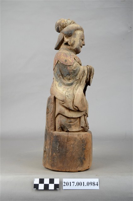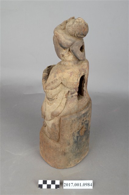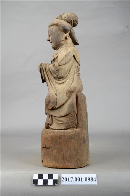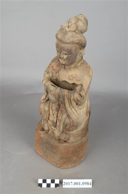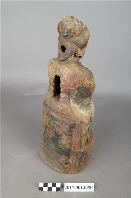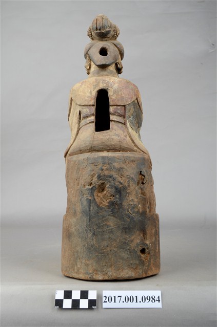 1.本件木雕碧霞元君像採坐姿造形,表面之漆面脫落。元君後腦杓有一圓形入神洞,背部有一長方形入神洞,封榫佚失,兩洞之內部物件已取出。碧霞元君坐在臺座上,臺座正面平整,後面呈弧形,底部有蛀蝕現象。碧霞元君端坐,雙足自然下垂,腳著弓鞋。臉型圓潤,臉孔娟秀,雙耳戴有耳飾,頭梳華麗的圓髻,上有漂亮的髮飾裝飾。身著寬袖袍服長裙、袖子下襬垂於兩膝外側,肩披如意雲肩。雙手交握於胸前,手掌藏於水袖內。