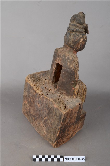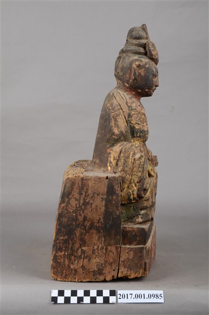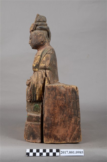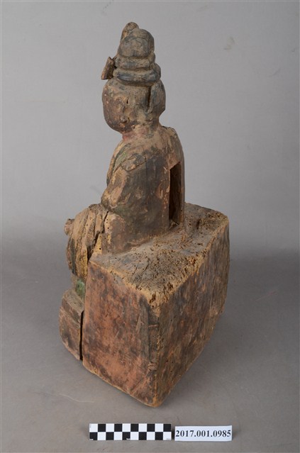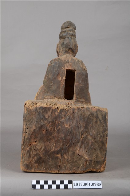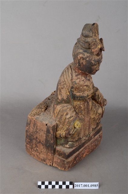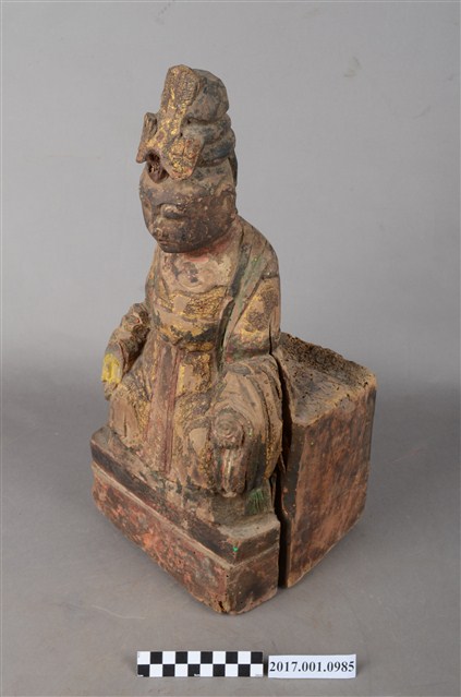 1.本件木雕碧霞元君像採坐姿造形,表面之漆面斑駁並佈有污漬,背面開有長方形入神洞,封榫佚失,內容物已取出。碧霞元君坐在臺座上,臺座正面作雙層,底層稍微凸出,上層內縮一點,底部平整,有蛀蝕現象與裂紋,臺座與元君身左有垂直縱裂紋,元君身右之臺座亦有一道縱裂紋。碧霞元君端坐,臉型圓潤,頭梳圓髻,前端有一鳳鳥髮飾,身著袍服長裙,腰下兩膝間垂一條劍帶形蔽膝,雙足自然下垂,腳著弓鞋。雙手下垂,分置於兩膝上,手掌掌心朝上,手指微曲,右手手指缺損。