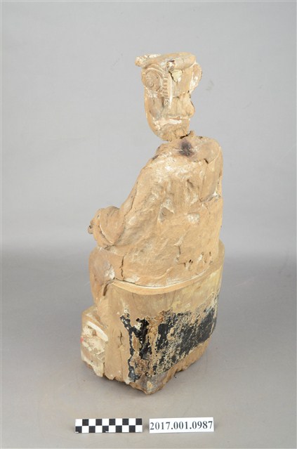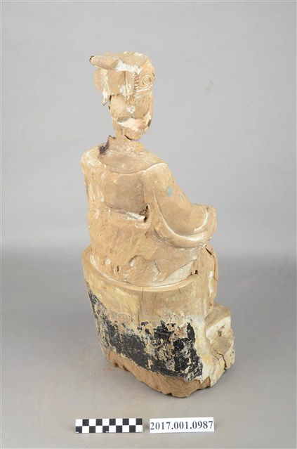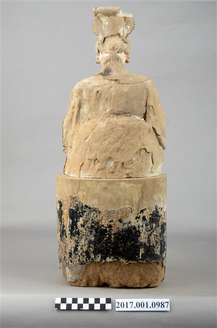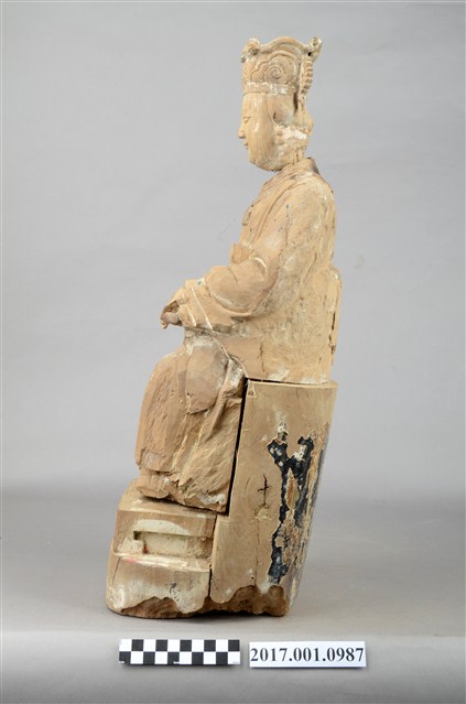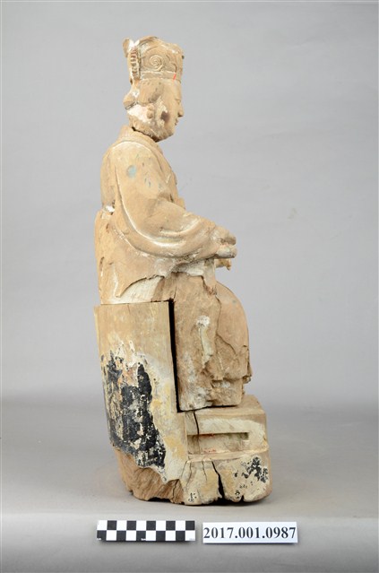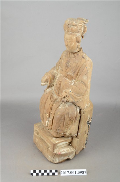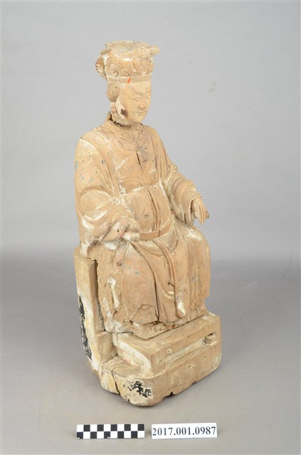 1.本件木雕碧霞元君像採坐姿造形,表面之漆面部分脫落,冠之右上方、頸部蛀蝕。碧霞元君坐在一張矮背圈椅上,椅座與神像可分離。臺座呈方形,元君腳下有一踏几,踏几之下另有臺座,底部崎嶇不平,有蛀蝕現象。元君端坐,臉型圓潤,臉孔娟秀,面帶微笑,頭戴冕冠,兩耳戴有耳飾。身著袍服長裙,腰束腰帶,頸掛「方心曲領」掛飾。雙足著弓鞋,踩於座前踏几上。兩手扶於座椅扶手上,左手手指下垂,右手手掌缺損。