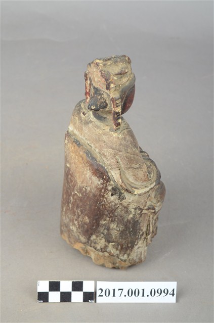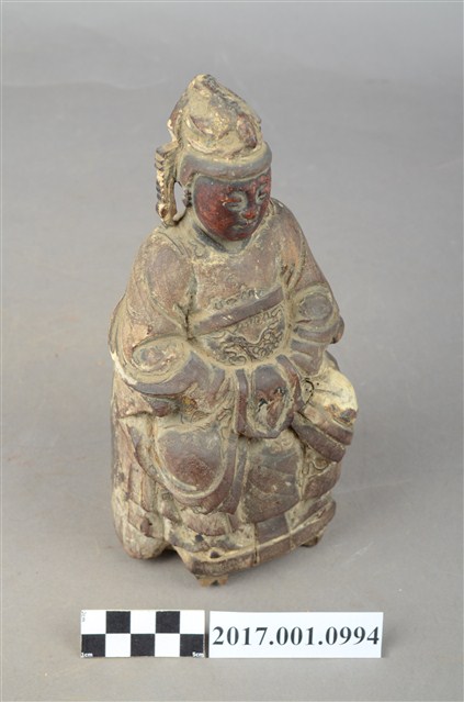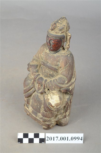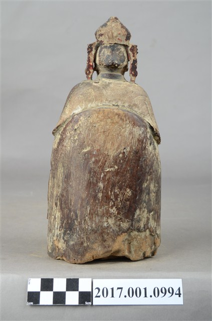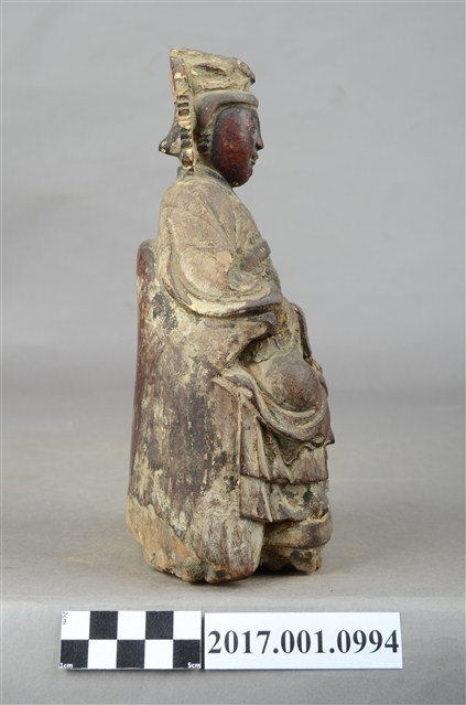 1.本件木雕碧霞元君像採坐姿造形,表面粧佛部分脫落,留有局部安金、漆線。碧霞元君坐於一張圈背椅上,椅下另有一大型方形臺座。碧霞元君端坐,臉型圓潤,臉孔娟秀,面帶微笑,上有絳紅色漆。頭梳圓髻,上戴一山形髮冠,髮冠鳳翅垂於兩耳側,後腦則有尖尾髻。身著圓領寬袖袍服、長裙,袍服上面有漆線圖紋粧佛,腰束腰帶,胸前有看帶。雙手交握於腹前,手掌藏於水袖內,左手袖襬有蛀蝕現象,且有垂直裂紋。雙足下垂,踩於座前踏几上,露出弓鞋鞋尖,踏几右足蝕損。