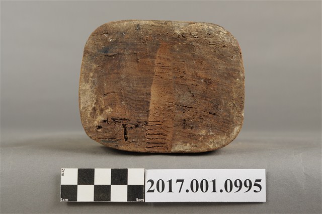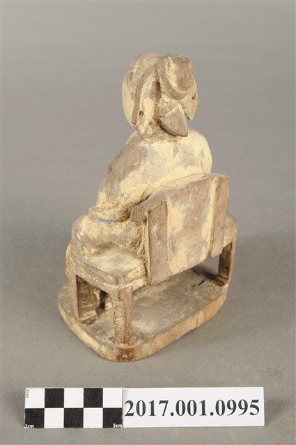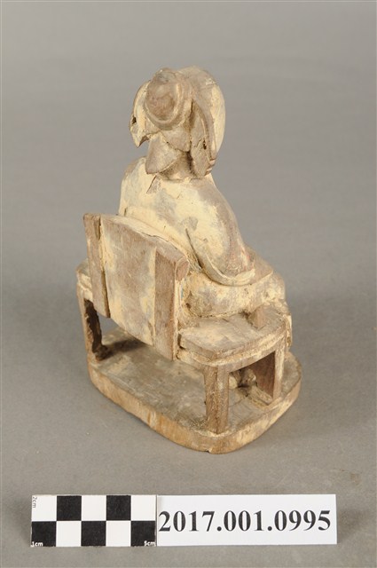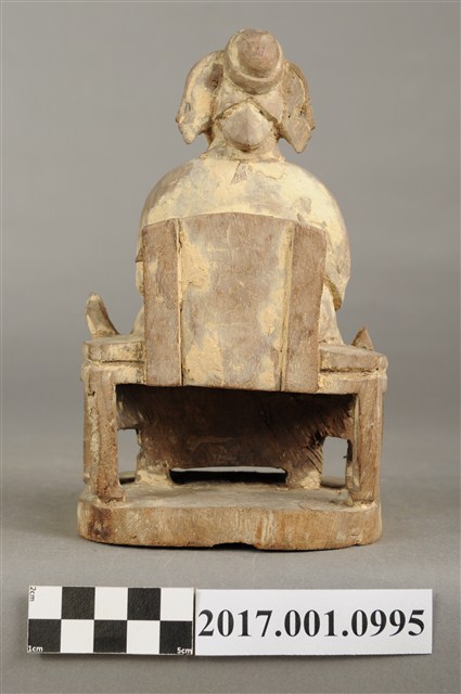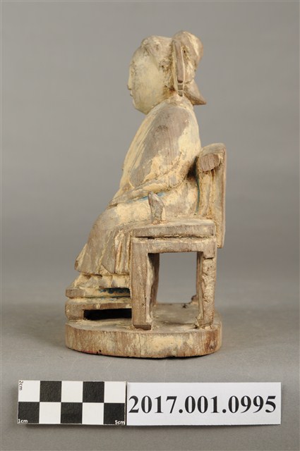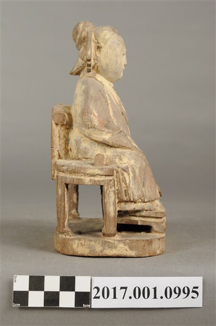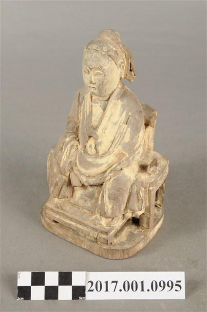 1.本件木雕碧霞元君像採坐姿造形,尺寸微小,表面粧佛已除去。碧霞元君坐在一圈背椅上,椅下鏤空,兩側扶手已缺損。椅下另有一大型木臺座,底部平整,呈方圓形。碧霞元君端坐,臉型圓潤,臉孔娟秀,頭梳一圓髻,頭戴方巾,方巾垂於兩耳側。身著圓領袍服,外罩對襟罩衫。雙手交握,置於右腰旁,呈抱袖狀,手掌藏於衣袖內。雙足自然下垂,腳著弓鞋,踩於一張方形踏几上。