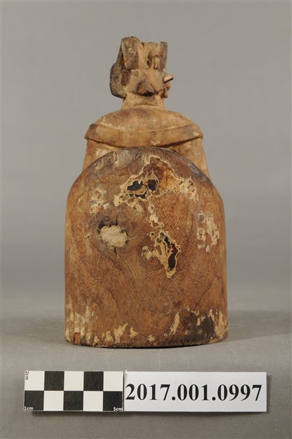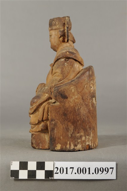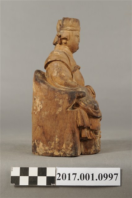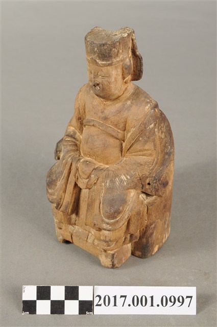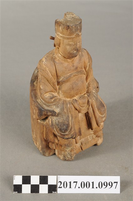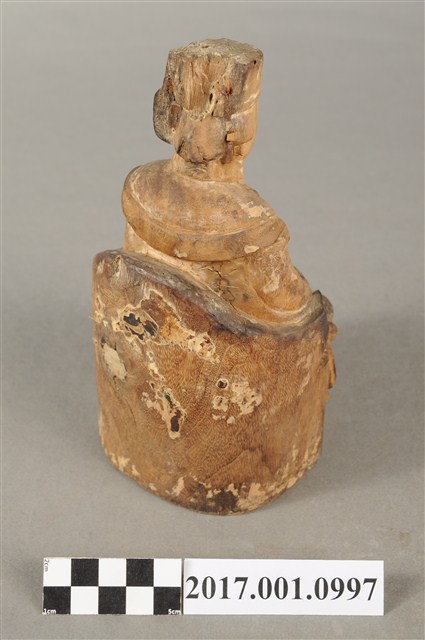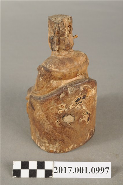 1.本件木雕碧霞元君像採坐姿造形,尺寸微小,表面粧佛已脫落。碧霞元君坐在一張圈背椅上,座椅扶手尾端缺損,底部平整,臺座呈前方、後方圓狀。碧霞元君端坐,臉型圓潤,臉孔莊嚴,嘴部恰好有神柴樹瘤之洞,故略呈黑色。頭戴大圓冠,冠帽正中央有一座小的山形帽飾,象徵泰山娘娘,冠飾垂於兩耳側,右側冠飾已缺損,冠的後方也有缺損。身著袍服長裙,雙肩披有長飄帶,飄帶垂於兩腋下,腰束腰帶,胸前有看帶。雙手交握於腹前,手掌藏於水袖內。雙足自然下垂,腳著弓鞋,足下另有一小型踏几。