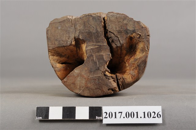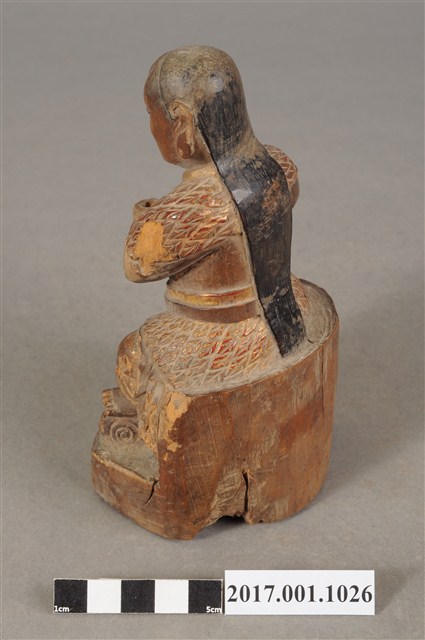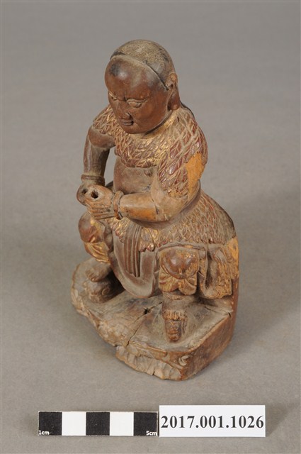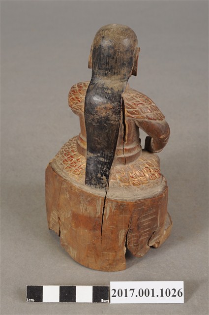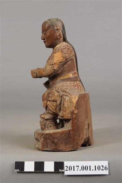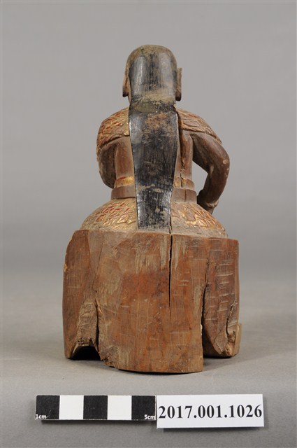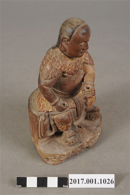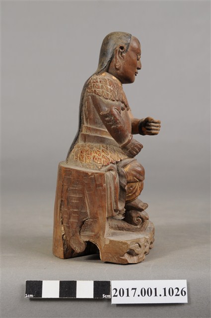 1.本件木雕盤古像,作坐姿姿態,表面施作塗裝、安金不見紅粧佛技法,粧佛局部剝落,底部有被挖鑿的痕跡。顏面表現皺眉,雙眼瞠目,顴骨與下顎凸出,肩披樹葉雲肩,袒胸露乳,下半身著長褲,褲外著裙與樹葉草衣,腰繫布帶,雙手佩戴手釧,跣足,坐於岩座上。挺身端坐,雙足垂下,雙腳踏輪,左手握拳持物橫伸向右,右手掌握拳持物置於腿上,持物已失。本件判斷為盤古,在於雙手手勢推測應一手握鑿子、一手握斧頭。