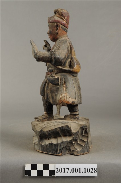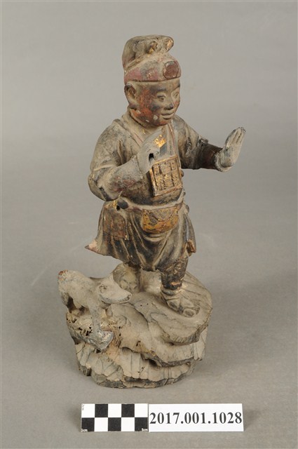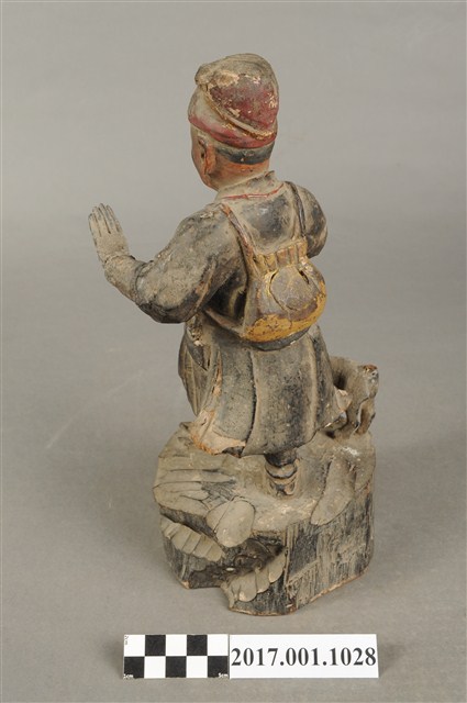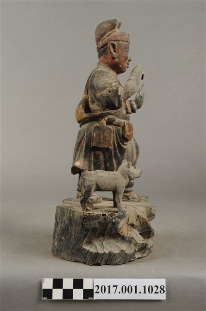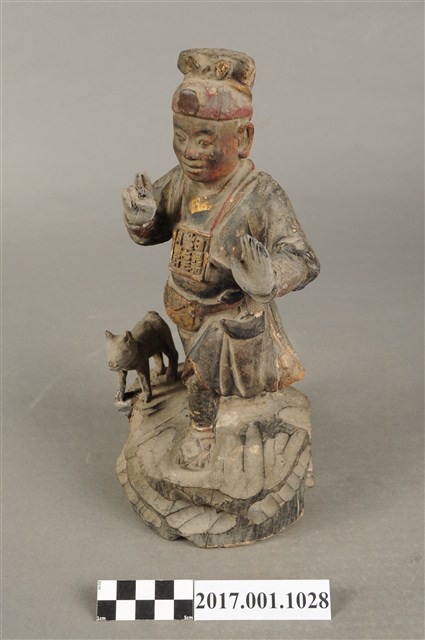 1.本件木雕盤瓠王像採立姿,站立於岩座之上。表面粧佛已褪去,並佈有灰塵。盤瓠王作年輕男子相貌,雙眼圓睜,臉上無鬚,頭戴幞頭,帽冠前一方圓形玉佩,身著窄袖斜襟過膝袍服,胸前配掛一方大印,印文書中央直書「盤古王」,左右分別為「日界」、「月界」,腰後佩戴竹甲,小腿綁腿,腳穿草鞋。左手小臂前伸,五指朝上,掌心朝外,右手小臂上舉,手結劍指。雙腳作左前右後類弓箭步姿勢。身右岩座邊緣站立一隻犬,四肢直立,頭部朝前,尾部缺損。