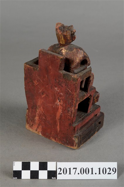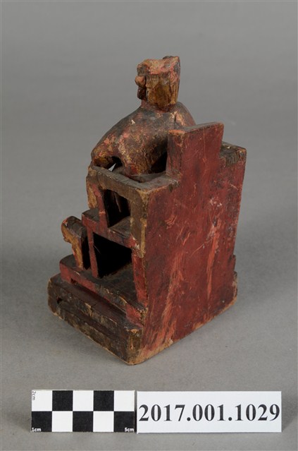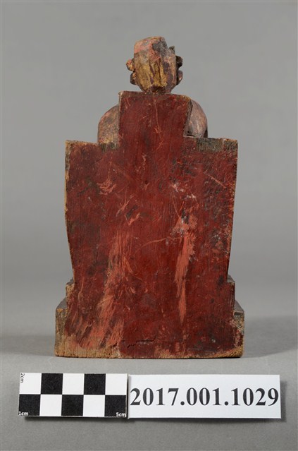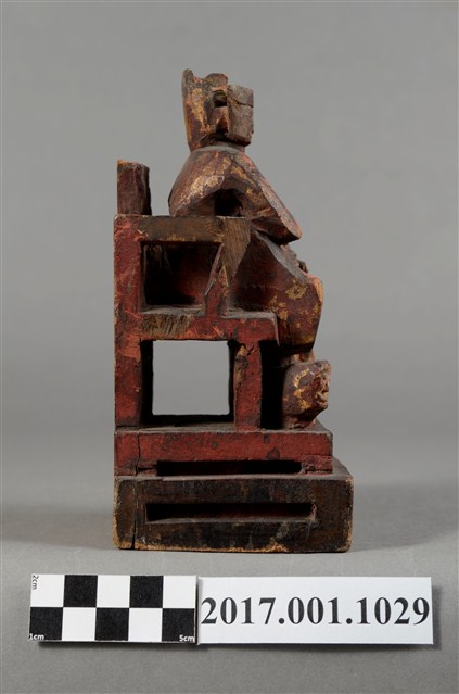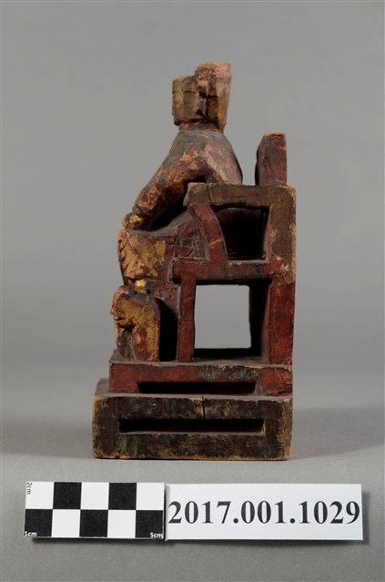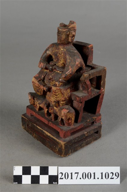 1.本件木雕廣澤尊王像,作坐姿姿態,端坐於屏椅上,表面施作塗裝、安金不見紅粧佛技法,安金局部剝落。臉型輪廓方正,顏面表現青年男性相貌,頭戴硬殼幞頭,身著窄袖盤領衣,腰束腰帶,腳穿皂靴,袍服於腰帶下雕刻獸頭。挺身端坐,左手放掌置於腿上,右手握著腰帶。左腳自然垂下,腳踏著獸座,右腳翹起,作單腳盤坐姿態。屏椅前有踏几,踏几上有兩個獸座。臺座作方臺。