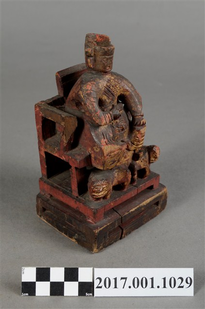 2.廣澤尊王又稱郭聖王、聖王公、保安尊王,為福建泉州南安當地神話的傳說人物,廣澤尊王名為郭洪福(或郭忠福、郭乾),傳說有風水師告訴他龍穴位置,要他將父親遺骸埋入龍穴,因為獲得風水的庇蔭,使他得以升天成仙,當他打坐升天時,母親拉住他的一腳,企圖阻止他成仙,因而造形都表現成翹腳。臺灣漢人泉州南安籍移民多奉郭聖王為族群守護神,而郭姓族人也將其奉為家族神。(富俐崴文化事業有限公司/謝宗榮計畫主持)