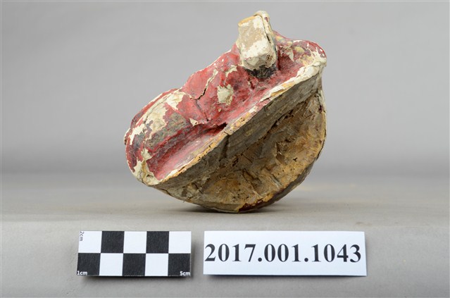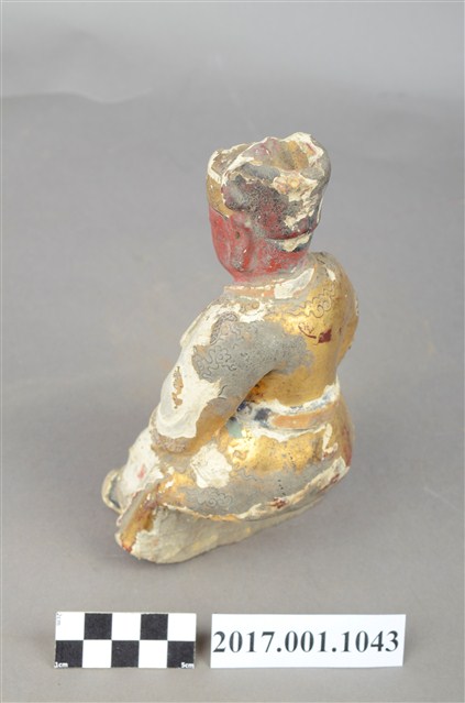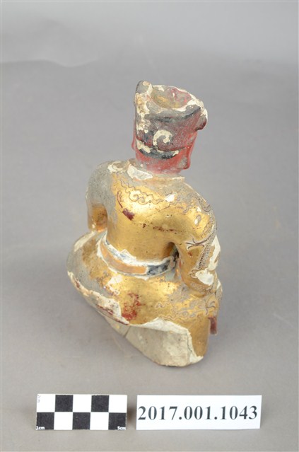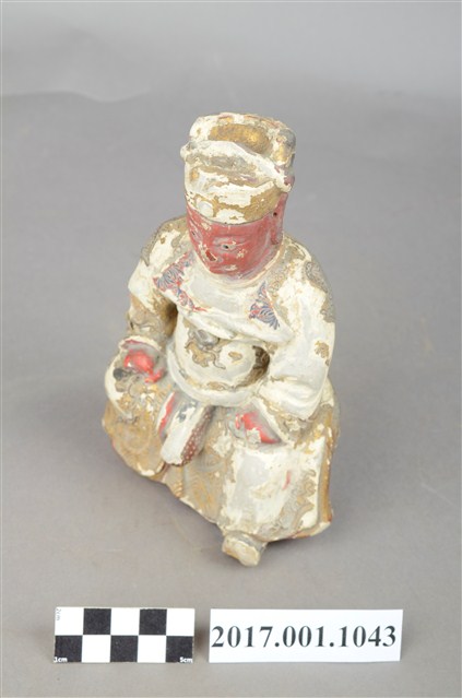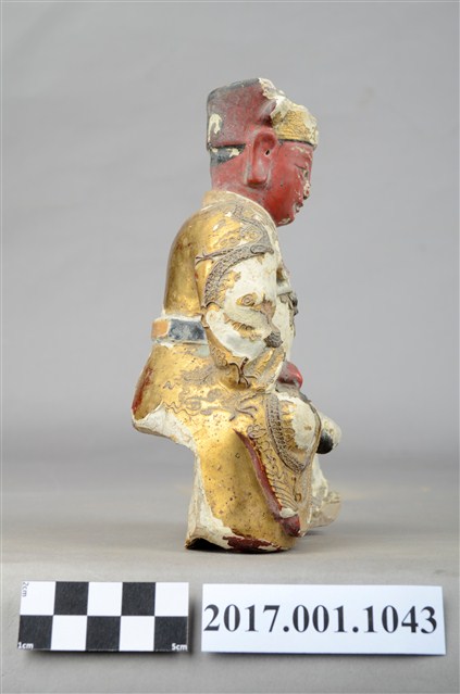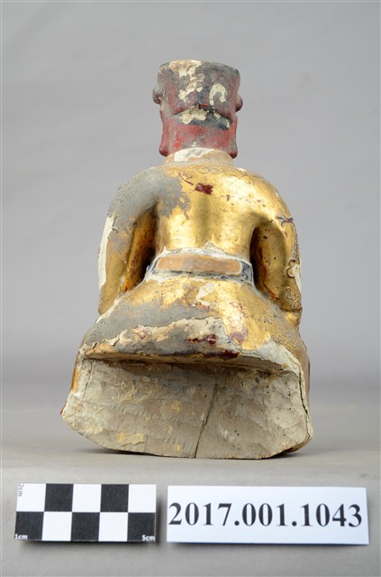 1.本件泥塑廣澤尊王像,作坐姿姿態,屬「脫椅」作法,椅座佚失,冠及袍服粧佛大面積剝落。臉型輪廓橢圓,雙眼圓睜,大耳,臉色朱紅,顏面表現青年男性相貌。頭戴三山帽,身著盤領袍,衣領向外翻,腰束護腹,護腹以看帶、腰帶固定,腳穿皂靴。挺身端坐,雙手握拳分置於腿上,左腳自然垂下,右腳翹起,作單腳盤坐姿態。