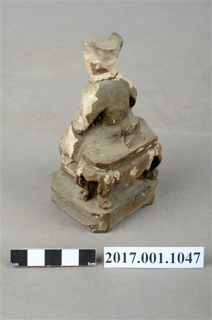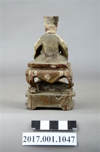 1.本件木雕廣澤尊王像,作坐姿姿態,坐於圈背椅上,粧佛剝落。臉型輪廓橢圓,雙眼半睜,顏面表現青年男性相貌。頭戴三山帽,身著窄袖大袍,大袍的衣領外翻,肚腹圓凸,腹下束腰帶,腳穿皂靴。挺身端坐,雙手握拳分置於腿上,左腳自然垂下,踏獸座,右腳翹起,作單腳盤坐姿態。圈背椅的椅被、扶手損毀,椅足雕刻螭虎吞腳,椅前放置踏几,踏几上有獸座。