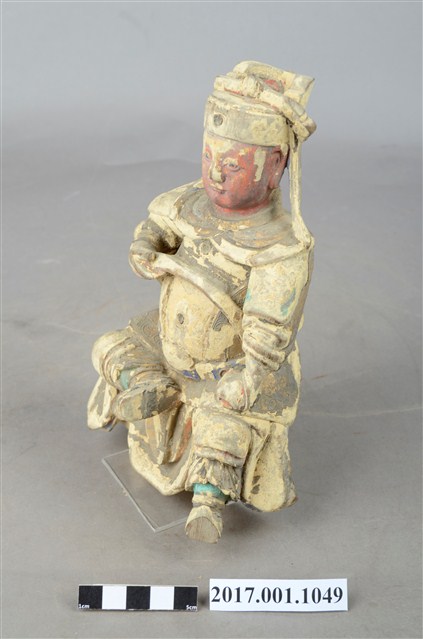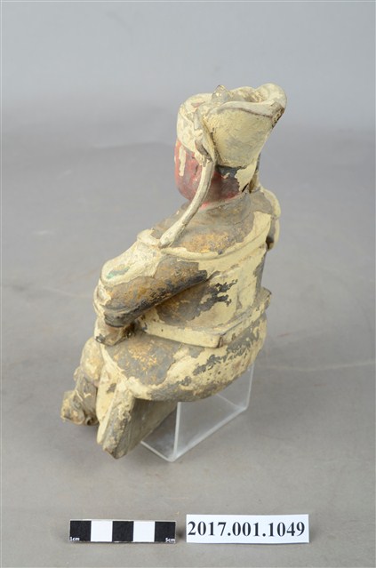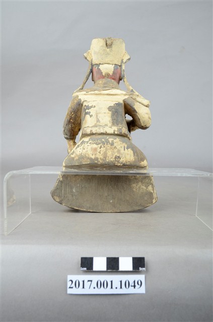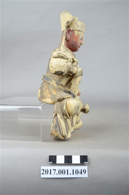 1.本件木雕廣澤尊王像,作坐姿姿態,屬「脫椅」作法,臺座已遺失,表面施作塗裝、安金不見紅漆線盤飾粧佛技法,粧佛剝落嚴重,背面開有方形入神洞,封榫尚存。臉型輪廓豐潤,雙眼圓睜,顏面表現青年男性相貌。頭戴幞頭,幞頭的兩道帽帶垂至兩肩上,身著盤領衣,下半身著長褲,肩頸披著披膊與護肩,腰束護腹,護腹以看帶、腰帶固定,腳穿皂靴,坐於圈背椅上。挺身端坐,左手握拳置於腿上,右手小臂上舉握看帶。左腳自然垂下,鞋尖削去損毀,右腳翹起,作單腳盤坐姿態。